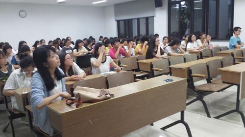 徐潋菡同学交流了自己赴英莱斯特大学访学的经历。主要介绍了莱斯特大学的基本情况、资助情况、雅思考试、申请流程。并从食、住、行、学、友五个方面分享了自己在国外的生活。她认为雅思备考要针对个人情况,凡事都有第一次,首次出国交流不要慌乱,做事要井井有条。林贝垚同学主要为学弟学妹们介绍了申请英国研究生的流程和相关注意事项,并为他们推荐了一些相关网站和论坛及微博账号,并分享了在英留学生活及英国的风土人情。交流会结束后,不少同学与两位学姐咨询相关事宜,两位学姐一一热心解答。