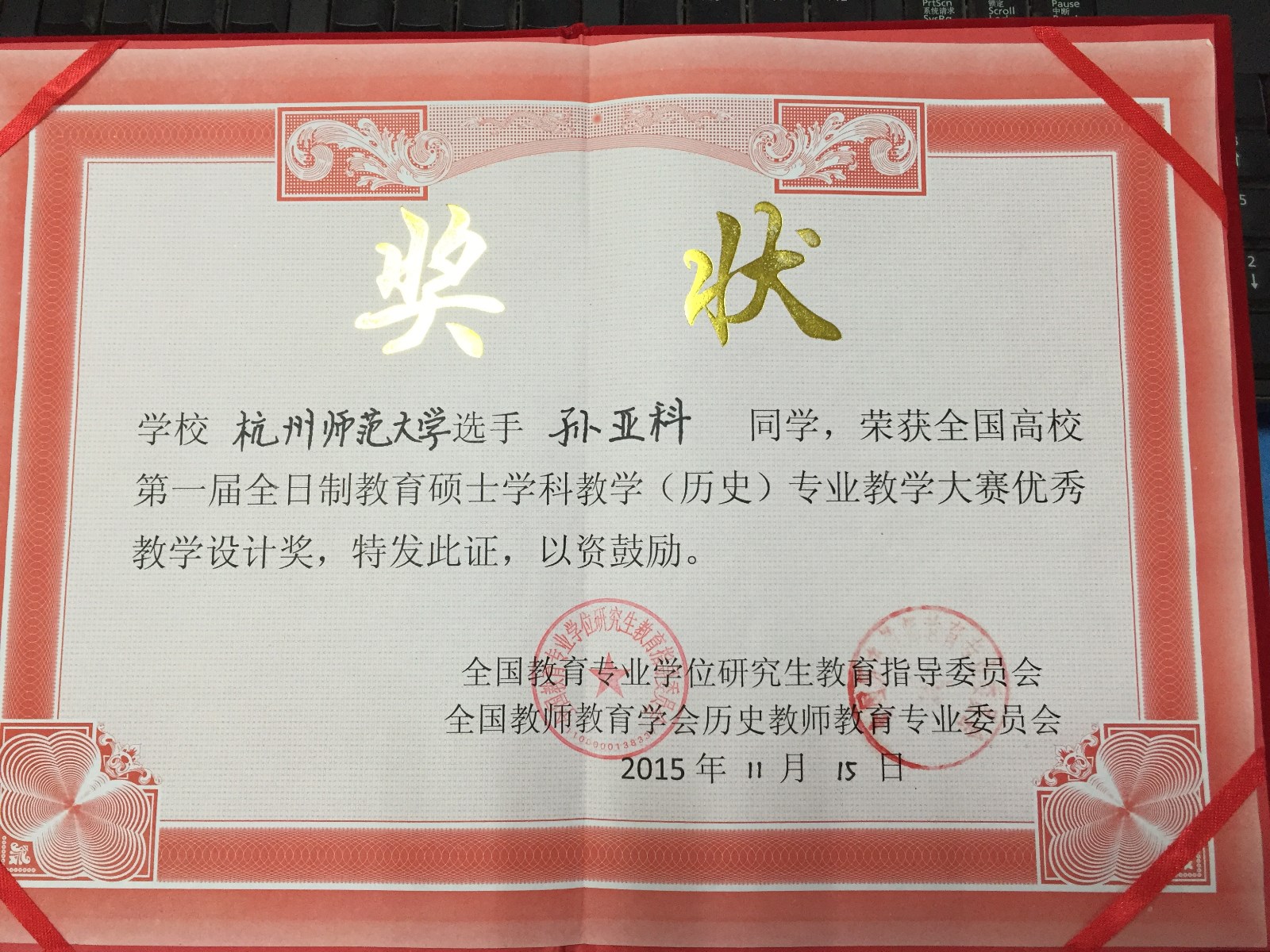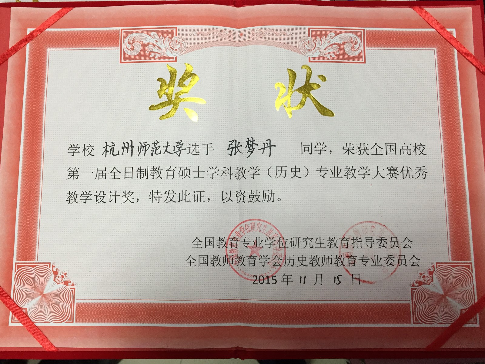 no视频 13级研究生张梦丹、孙亚科两位同学,荣获全国高校第一届全日制教育硕士学科教学(历史)专业教学大赛优秀教学设计奖。