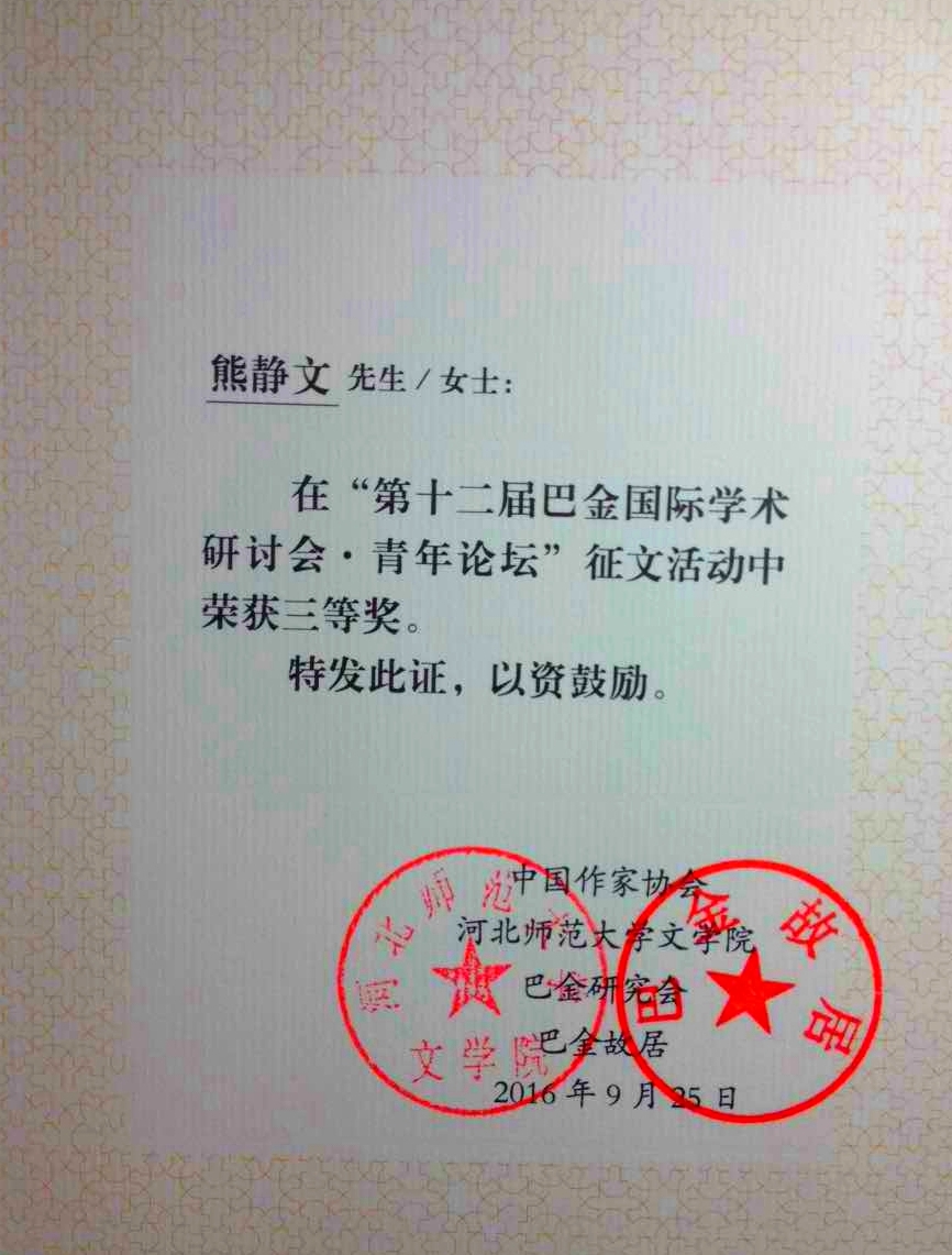9月24日至25日,由中国作家协会、河北师范大学文学院、巴金研究会、巴金故居主办的第十二届巴金国际学术研讨会在河北师范大学举行,no视频 2015级现当代文学专业研究生熊静文的论文《“走”与“停”:论巴金小说中家庭观念的演变——以<家><憩园><寒夜>为例》在“青年论坛”中喜获三等奖。