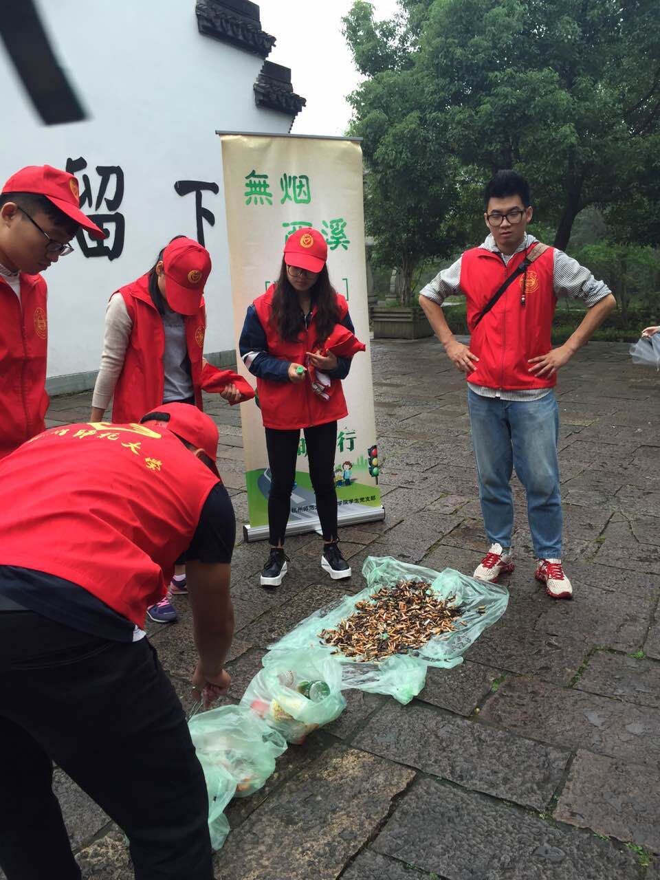 清晨,一群身着红色志愿者服装的学生党员早早来到了西溪湿地,在老师的带领下,学生党员们支起了“无烟西溪”的宣传海报。简单分工后,学生们带上垃圾袋、拿上垃圾夹便出发了。一时间,在西溪湿地公园各处都出现了一个个穿着红色志愿者服装,戴着小红帽的身影,他们不停地在路面缝隙中捡拾丢弃的烟蒂,看到正在抽烟的游客就主动上前劝导。过往游客不时询问党员志愿者们的义行并拍照。