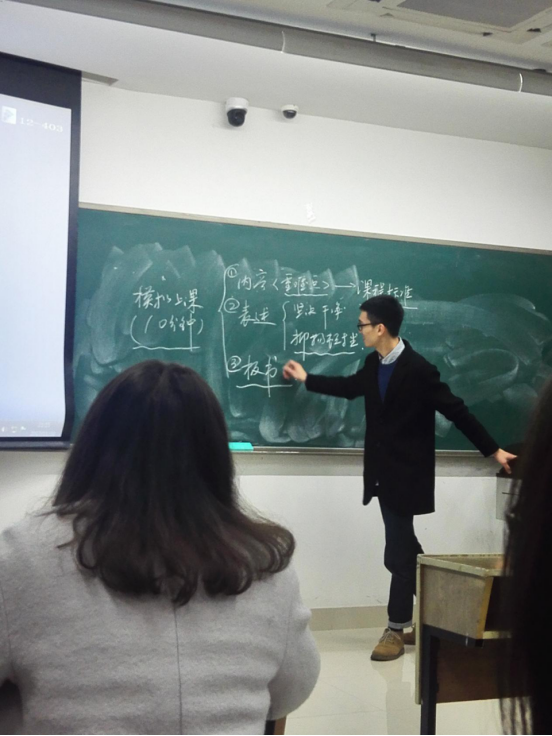 范江凯学长首先向我们介绍了进入师范生技能大赛省赛的流程和具体内容。随后,范学长向我们展示了两道演讲试题,并引导同学们自主参与回答、相互点评,令在场同学受益匪浅。同时,他还向大家展示了去年的省赛视频,并通过视频明晰省赛各个环节的注意事项。在综合素质方面,学长强调了平时积累的重要性,认为师范学子应该将学识积累当作一种日常,在每天的学习中巩固基础。而在教学能力这一方面,范江凯学长总结道:“第一,要练好基本功,学好学科知识,开拓视野;第二,要表达要坚决、干净;第三,板书要多练习,要有逻辑性”,他还建议大家回归课本,并以课本范文为例,对如何合理设定教学目标和培养自己的分析能力做了详细的阐释。最后,他还指出了大家观念中可能存在的一些误区,并表达了对学弟学妹们的美好希冀。