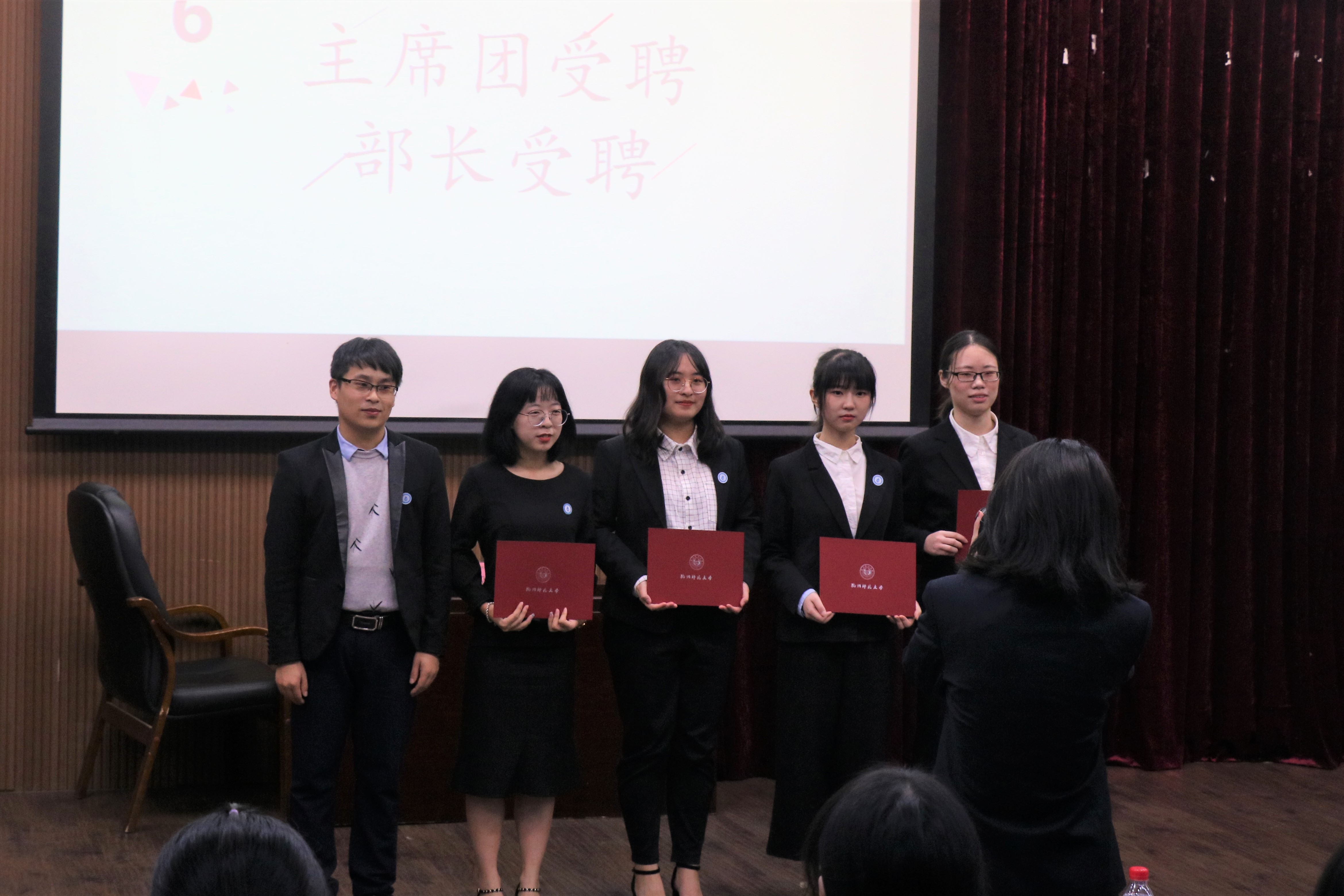 发言结束后,主席团和部长受聘仪式正式开展。伴随着神圣的背景音乐,主席团上台接受孔祥亮老师颁发的证书。接着,主席为各自分管的部门部长颁发证书,并合影留念。最后,依次上台的22个部门干事代表接受主席佩戴的团学徽章,同时各部门部长给干事颁发聘书。