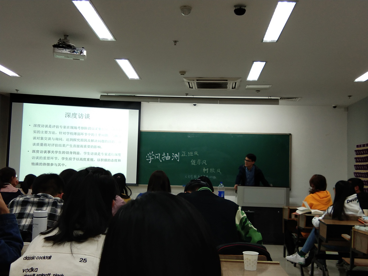 为了迎接本科教学审核评估,积极支持和配合学校学院的工作,让我班同学对评估工作的意义和重要性有一个清晰的认识,并将其落实到日常行为之中。no视频 历史学类181班于2018年10月28日在恕园9号楼303教室,召开了“学风抽测——正班风、促学风、树校风”的主题班会。