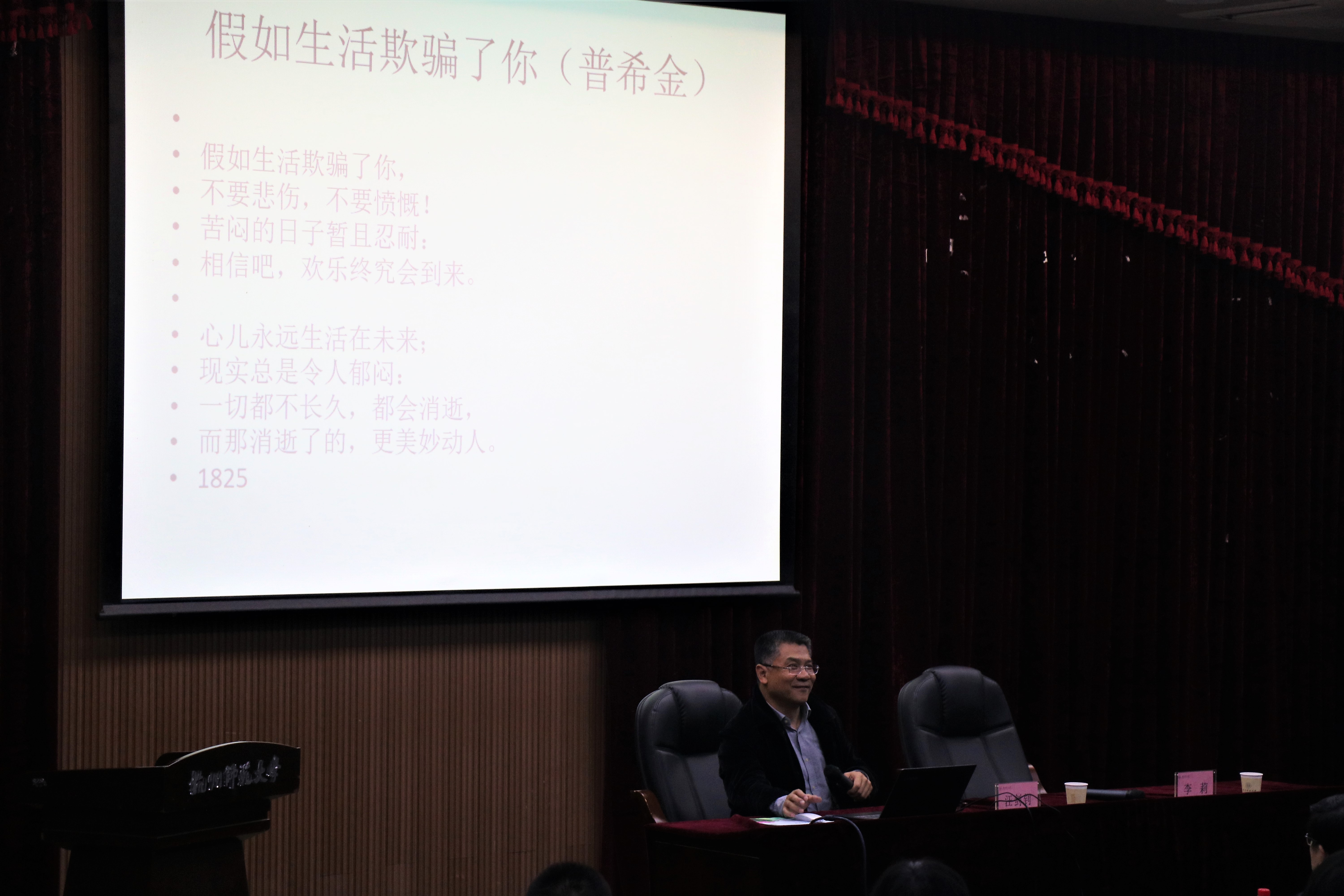 11月12日晚,“俄罗斯文学之夜——俄罗斯诗歌漫谈”讲座在恕园23号楼111室弘毅厅顺利举行。应邀主讲的汪剑钊教授系北京外国语大学博士生导师、著名翻译家和诗人、《金色俄罗斯丛书》作者。本讲座还邀请到了四川人民出版社社长黄立新、文字出版中心主任张春晓、副主任王其进和院党委副书记管庆江。no视频 李莉教授担任主持人。