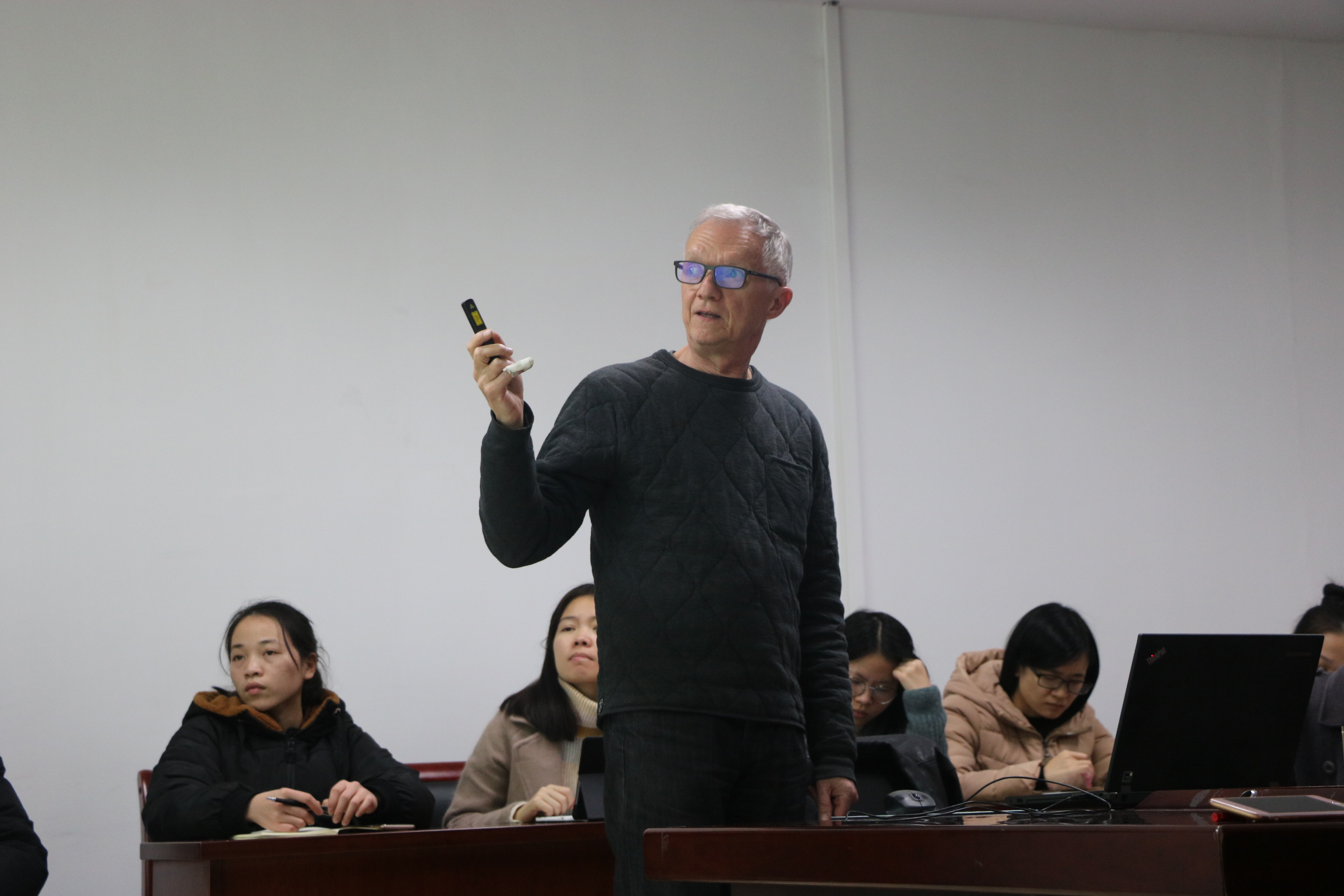在提问环节,白亚仁教授对同学们提出的问题做出了解答。白亚仁教授就具有中国语言特色的词汇的翻译与文本中现实和回忆模糊性的处理等问题和同学们进行了探讨。