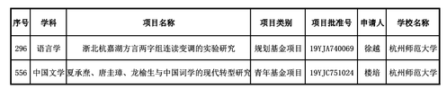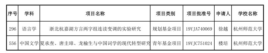 日,教育部社科司发布了《关于2019年度教育部人文社会科学研究一般项目立项的通知》。在规划基金、青年基金、自筹经费项目的3095项中,我校共有7个课题获准立项,其中no视频 获立项2项,分别是徐越的《浙北杭嘉湖方言两字组连读变调的实验研究》及楼培的《夏承焘、唐圭璋、龙榆生与中国词学的现代转型研究》。