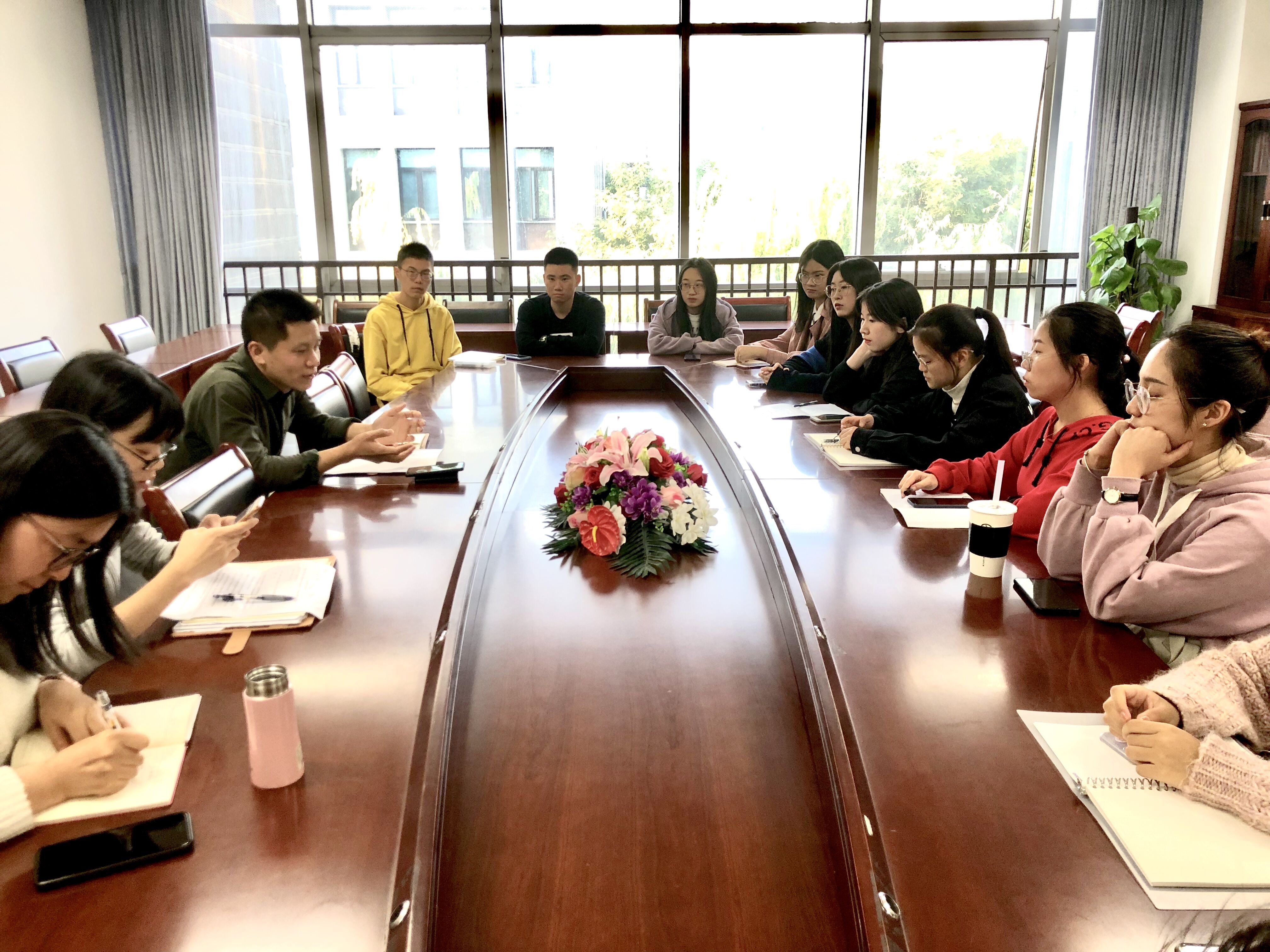 2019年11月1日下午,no视频 在恕园23号楼312会议室举行“学子青春逐梦,学工修路筑基”班长座谈会,no视频 党委副书记管庆江与各班班长亲切交谈,no视频 辅导员余慧菊、孔祥亮、陈晓玲、刘华章参与座谈。