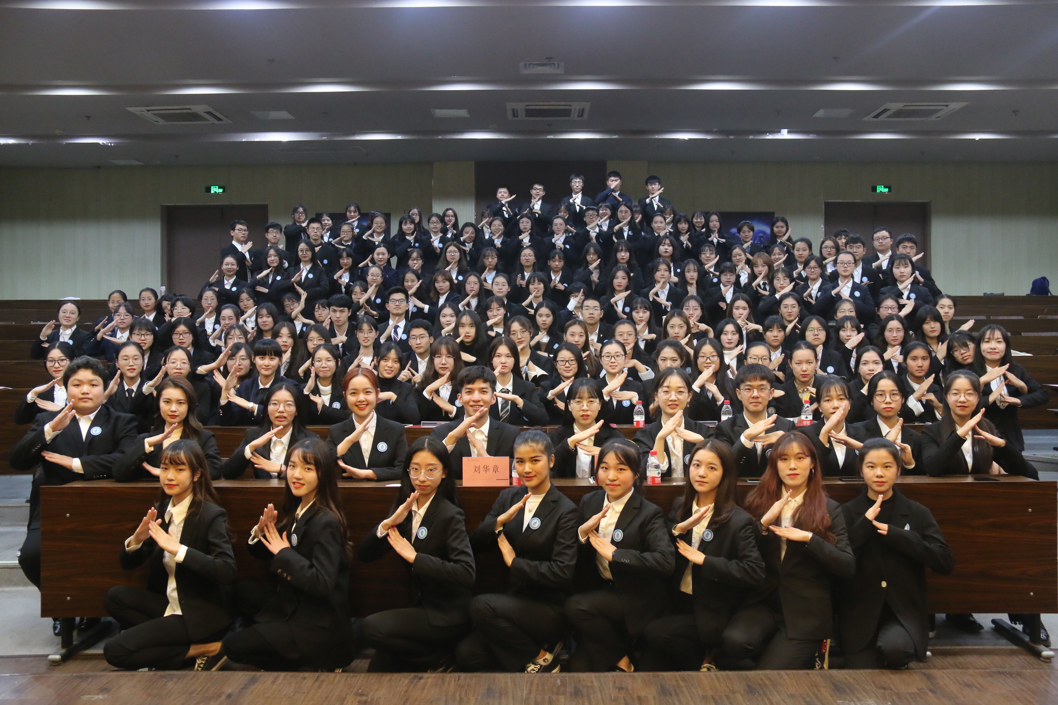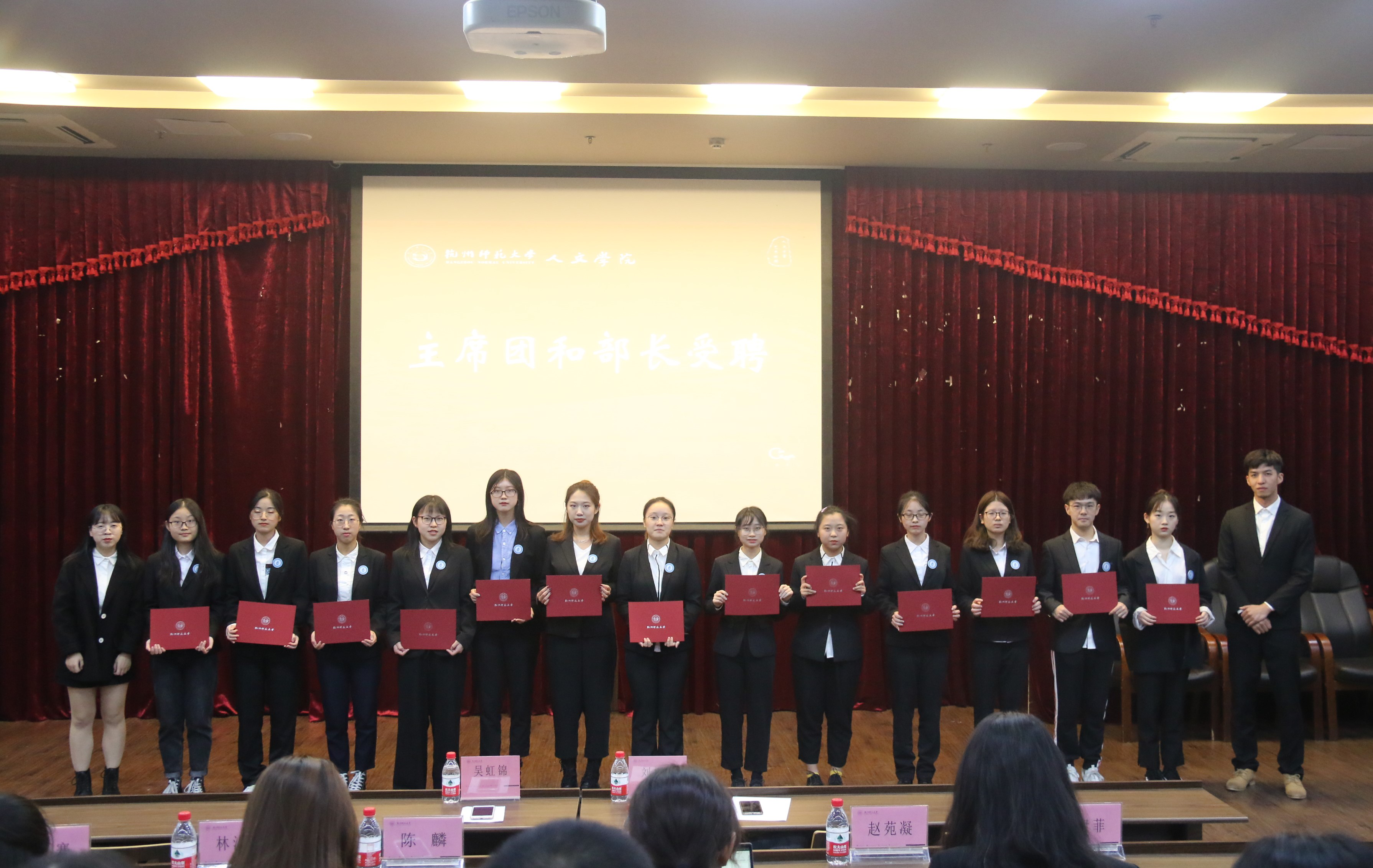 各代表发言结束后,举行主席团和部长受聘仪式,由刘华章老师颁发证书并合影留念。随后,举行干事转正仪式,由各部门部长授予聘书并合影留念。最后,转正大会在全体成员合唱《爱因为在心中》与合照留念中结束。(文/刘千瑜、图/潘天晶)