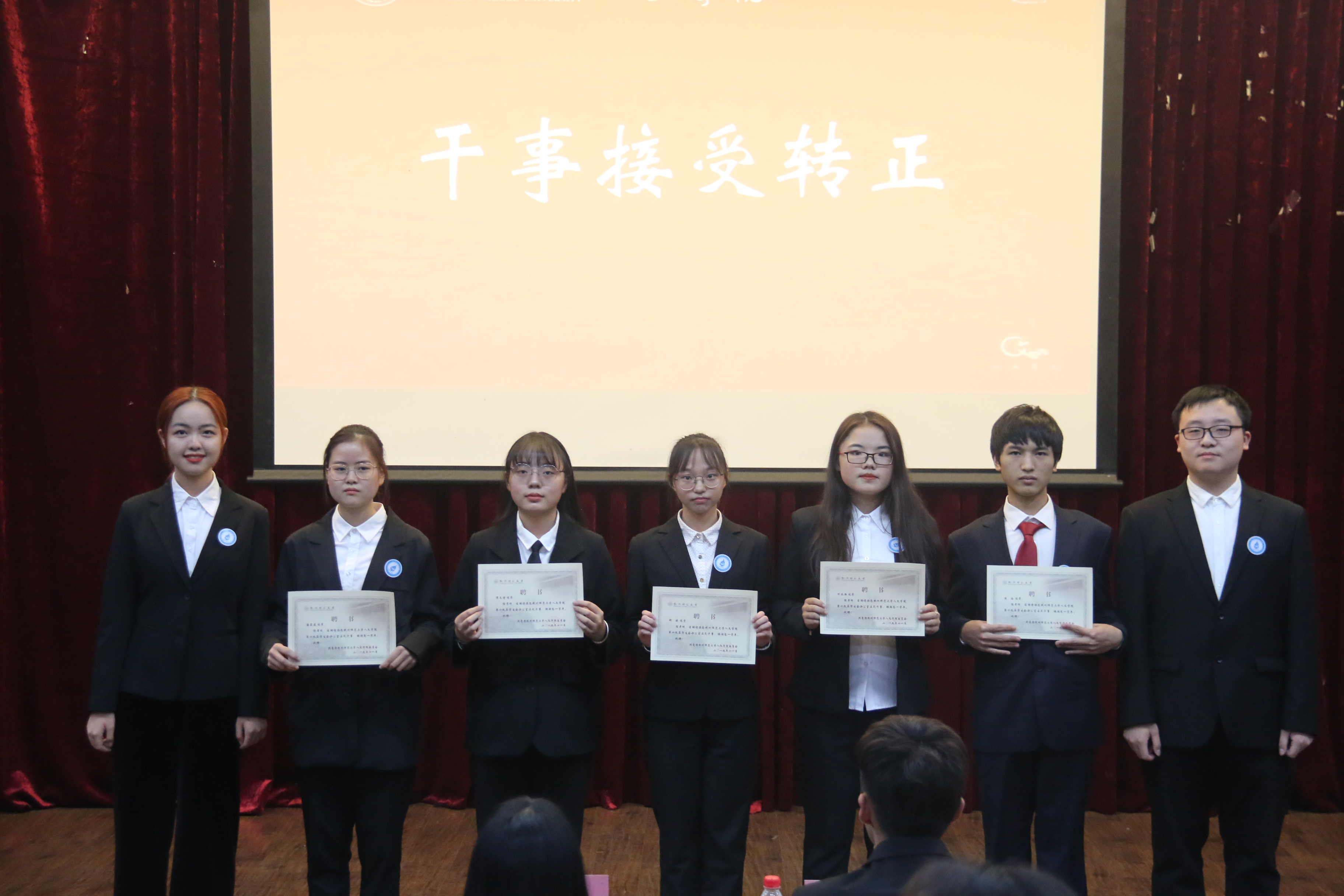 11月16号晚,no视频 第七届团委、第二届青年志愿者协会、第十九届学生会、第二届全媒体中心干事转正仪式暨主席部长受聘仪式于恕园23号楼弘毅厅顺利举行。no视频 团委老师刘华章老师应邀出席大会,no视频 团委学生会全体成员正装参加。