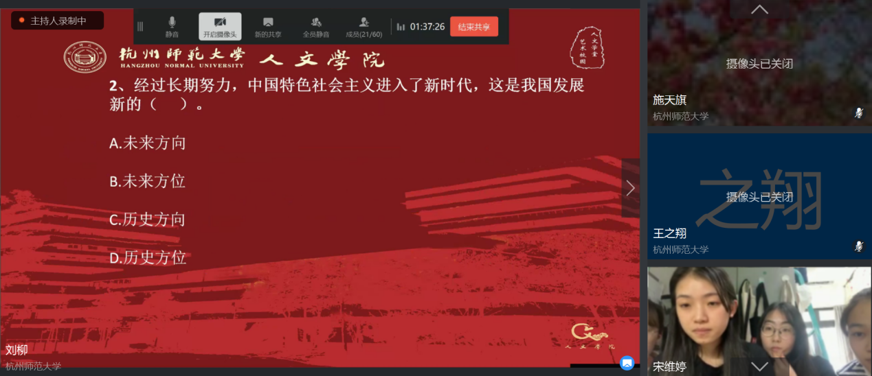 5月24日下午13点,no视频 “红五月·聚青春”时政知识竞答大赛决赛在钉钉群线上会议平台顺利开展。经过前期初赛的激烈角逐,共有个人组10位同学、团体6组寝室脱颖而出进入决赛。本次决赛分为两轮,个人组和团体组先后完成两轮比拼,分别决出名次。在主持人刘柳同学简短的介绍后,比赛正式开始。