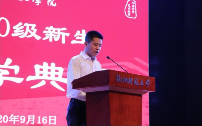 洪治纲在典礼上致辞,代表学院向2020级新生表示热烈的欢迎和祝贺。他表示,2020级本科新生“生于非典,考于新冠”,应当感受到自己的不平凡,更应当不辜负自己的不平凡。他以无数的网店组成了现代生活为例,指出任何微小的事物都有不容小觑的力量。以此为突破口,洪院长告诫新生,当全新的舞台展现在面前时,应当留意微小事物、敬畏微小事物、并从细微之处做起,发扬水滴石穿的精神,在大学四年的岁月篇章画上浓墨重彩的一笔。