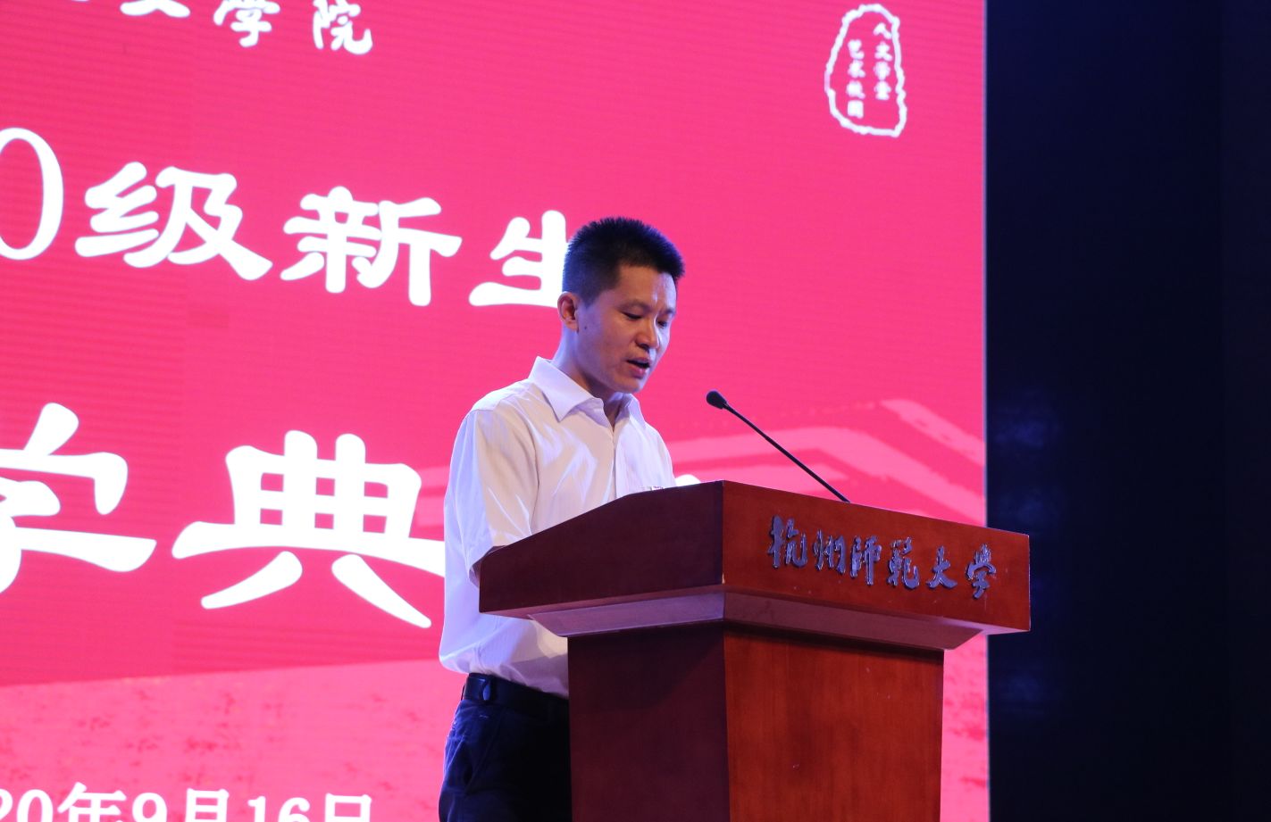 9月16日晚,no视频 2019级新生开学典礼在学术交流中心叔同剧场举行。学院院长洪治纲,党委书记诸英,副院长陈兆肆、刘正平,党委副书记兼纪委书记管庆江,院长助理林航,中文系主任刘小刚、历史系主任周东华,全体新生班主任、辅导员、教师代表和2020级本科生、研究生等共聚一堂。历史901班校友、来自嘉兴一中的全国优秀教师余文伟应邀参加典礼。典礼由管庆江主持。