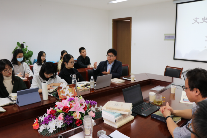 刘正平老师介绍了举办文史研读会的初衷和构想,在于打破学科隔阂,倡导师生共读,促进文史融合。所有研读书目均由专业导师反复斟酌、精挑细选,来参加现场研读的导师和同学们也都做了比较充分的准备。希望师生们能一直积极参与,将这项有意义的活动坚持下去。林航认为,文史研读会有助于研究生们形成良好的学术阅读氛围,他鼓励同学们在研究讨论的过程中提出问题,自信地表达自己的观点。陈兆肆老师就选读葛兆光先生相关著作的目的做了说明,并就葛著的学术价值做了精彩陈述。王晶波、胡悦晗等老师向同学们分享了本次研读会的部分阅读书目和自己的学术见解,回答了同学们的提问。