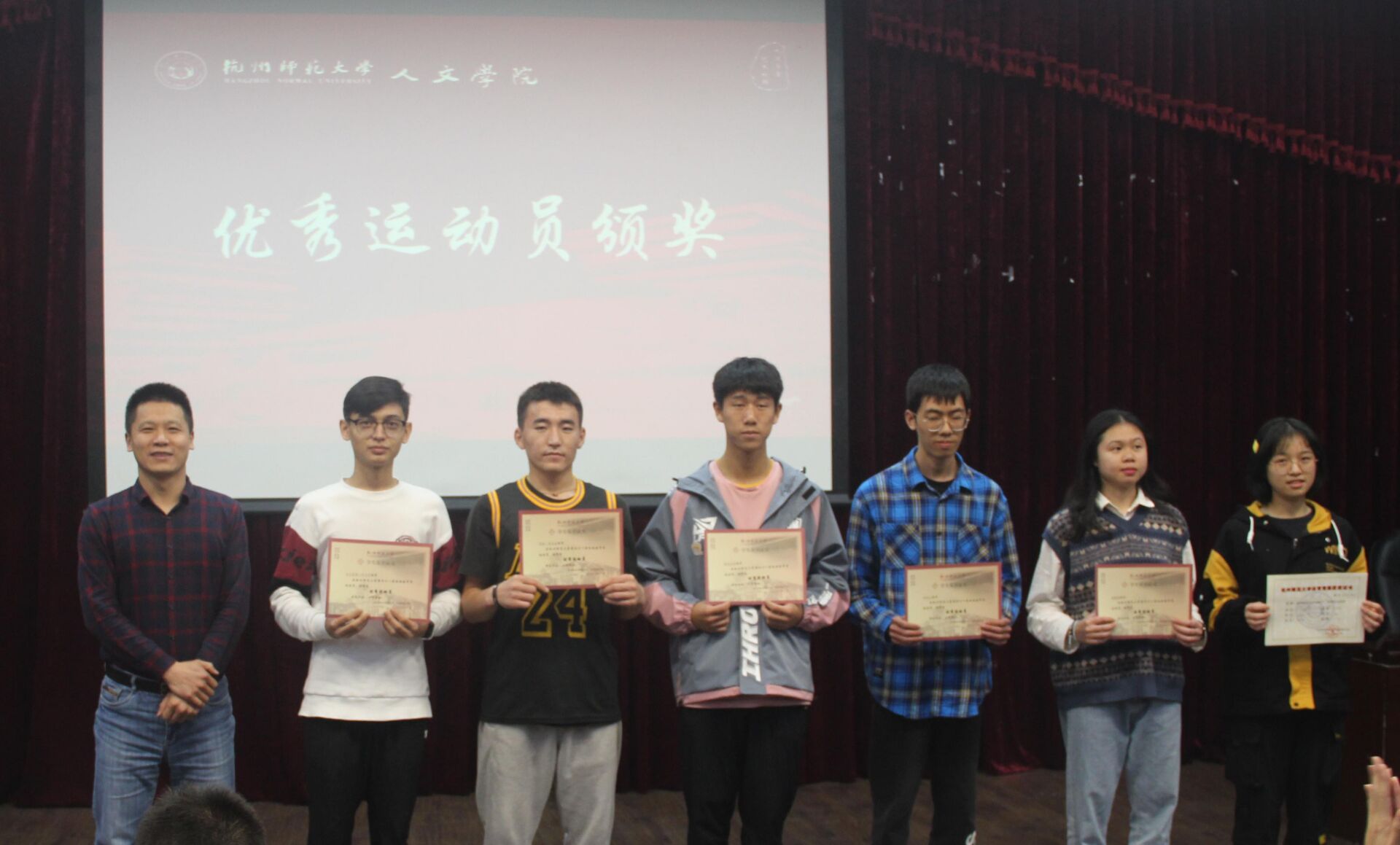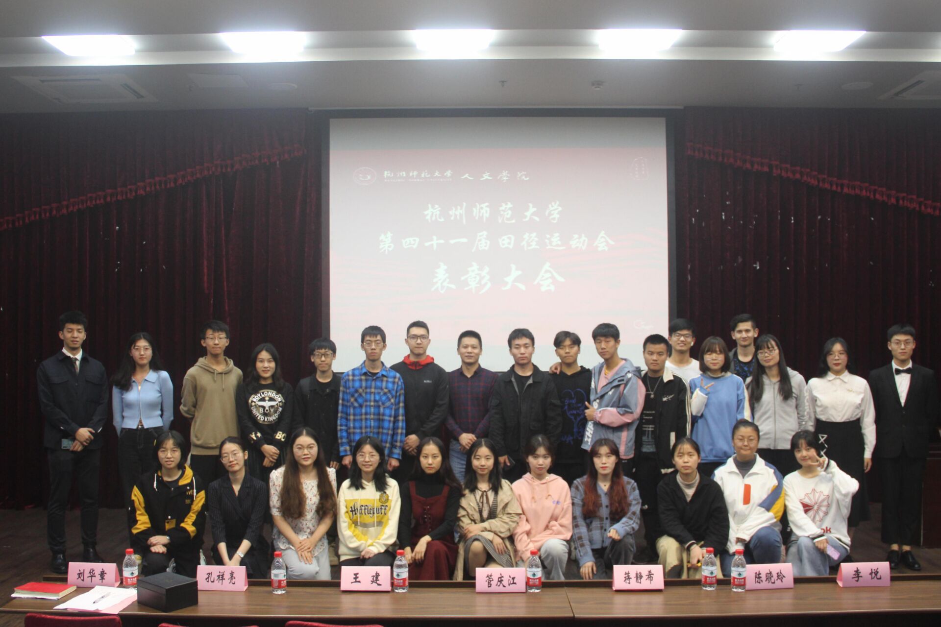 11月19日下午16点50分,no视频 在恕园23号楼弘毅厅举行第41届校运动会no视频 表彰大会。院党委副书记管庆江,院团委书记孔祥亮,学工办主任陈晓玲,辅导员刘华章、李悦,no视频 田径协会荣誉主席王建,团委学生会主席团和全体部门负责人,校运动会对接体院教练以及第41届校运会个人、团体项目的获奖运动员出席大会。