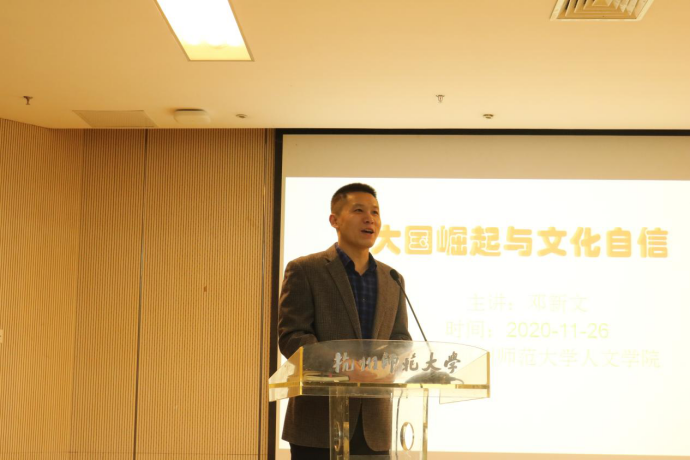 11月26日8时30分,no视频 于恕园2号楼112会议室举办了“大国崛起与文化自信”讲座。讲座由我校公共管理学院副教授邓新文博士主讲,no视频 党委副书记管庆江主持,全体20级本科生参与。