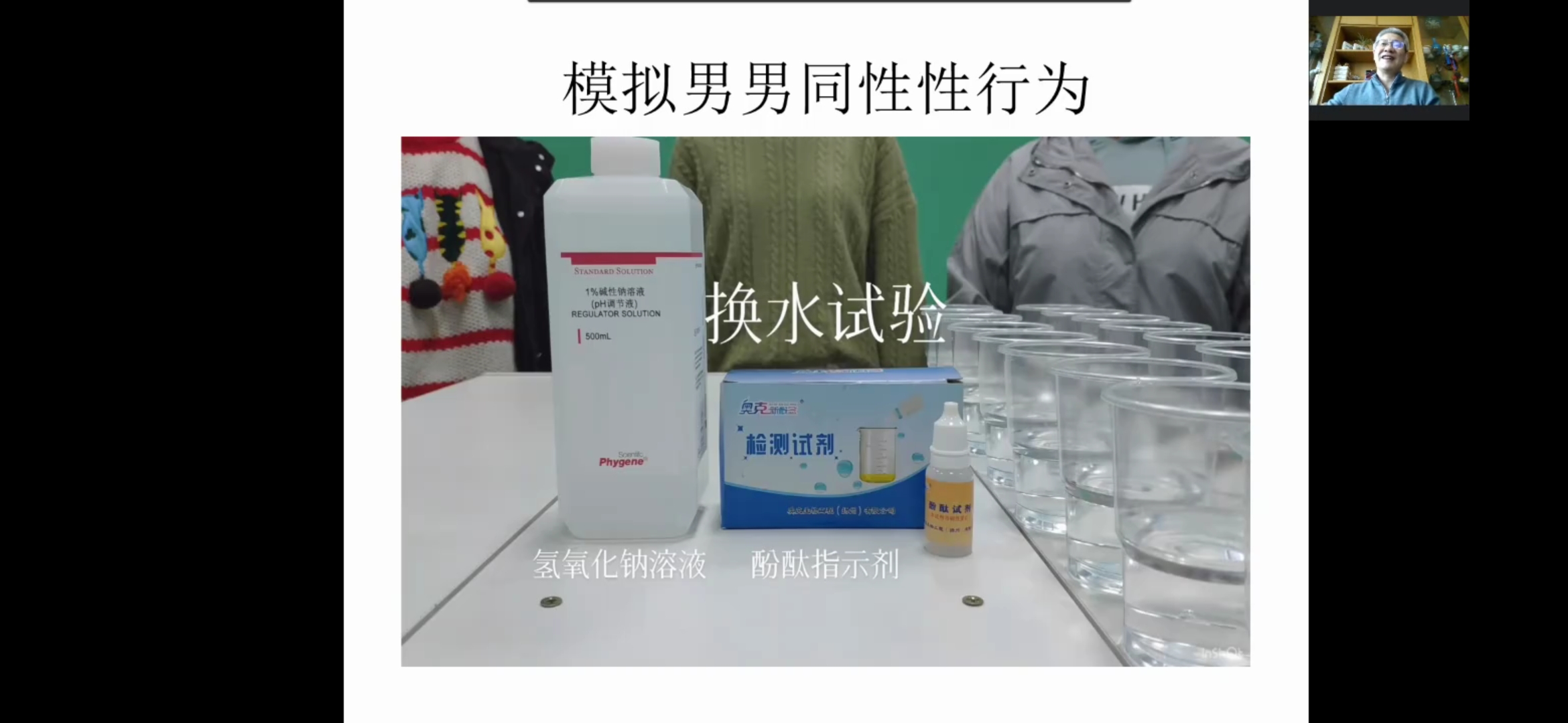 刘纯表示,艾滋病的青年学生病例以大中专院校学生、男生为主,这些青少年学生好奇与侥幸心理作祟,最终不幸感染上了艾滋病。为了加深学生对性传播的认识,刘纯播放了一段模拟男男性行为的学生实验录像,实验以水杯、检测溶剂、氢氧化钠溶液为材料,通过水杯中含有氢氧化钠溶液的传递流动表示性行为导致的病毒传播,最终以大部分水杯中液体变色表示被感染作为实验结果。刘纯介绍了防艾的策略方法,并提出重点:一是高校要进行健康宣传、同伴教育,二是学生要自我约束。