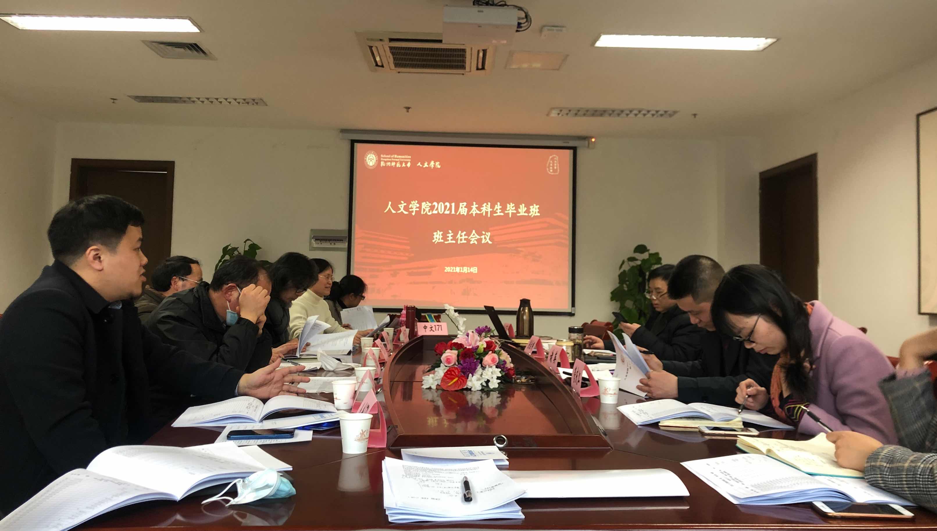 1月14日下午,no视频 在恕园23号楼312室召开2021届本科生毕业班班主任会议,重点围绕就业工作进行研讨。学院院长洪治纲、党委书记诸英,党委副书记管庆江,2020届优秀班主任代表黄岳杰,全体2021届本科生毕业班班主任和全体辅导员参加会议。会议由管庆江主持。