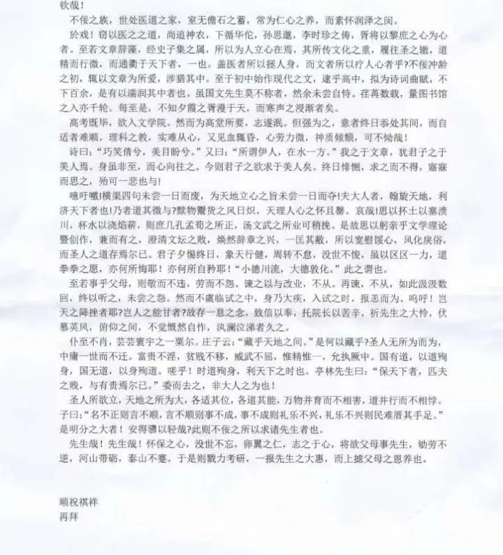 5月31日,no视频 院长洪治纲早上刚到办公室,看到了门缝里塞着这样一封信,通篇文言文,约1200字,打印在一张纸上。从信的内容,可以看出这是一个医学院学生写的。