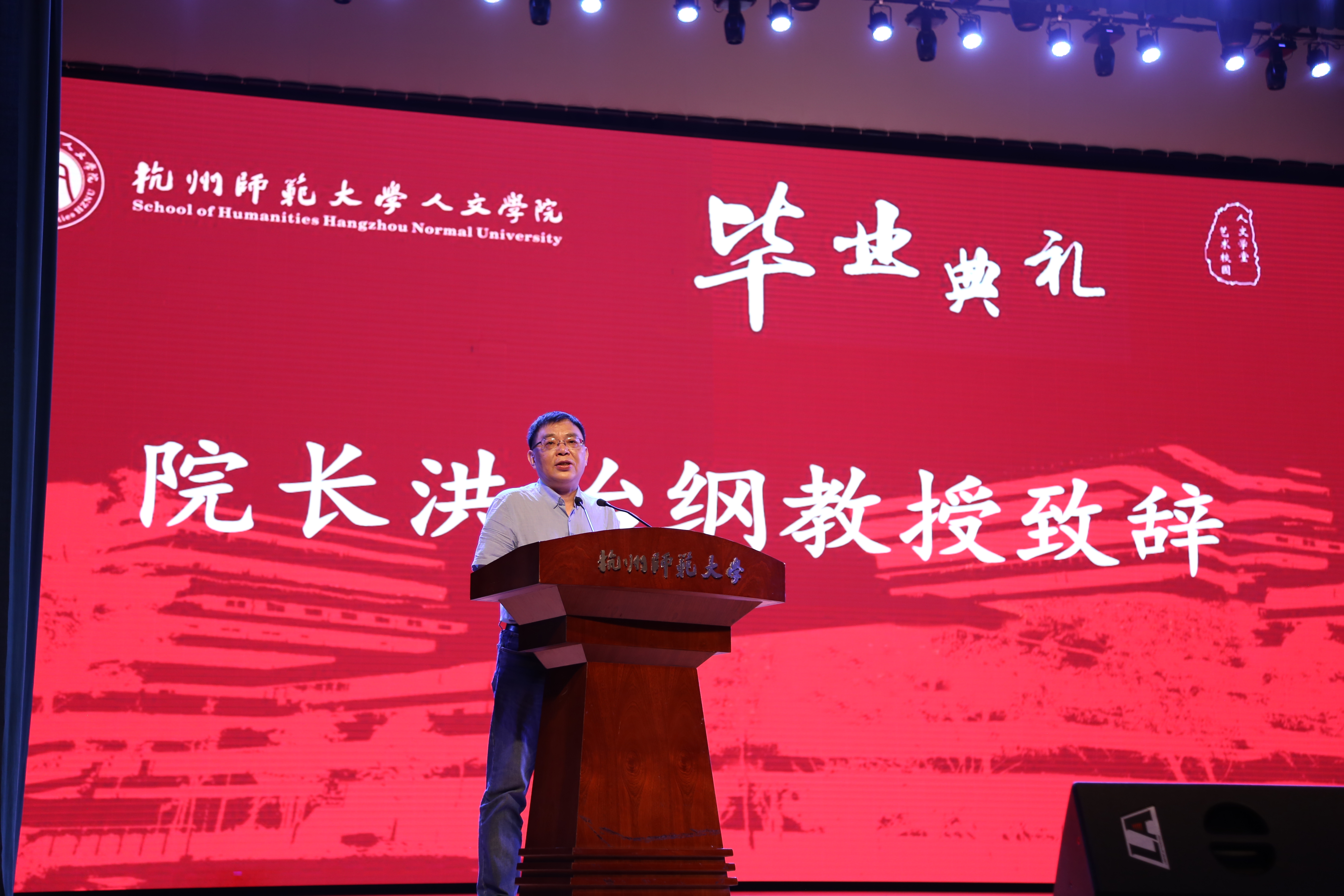 毕业典礼上,院长洪治纲教授致辞。他首先代表学院向圆满完成学业的毕业生们表示热烈祝贺,同时向对学院作出贡献的老师和学生表示感谢。他表示毕业是步入人生之路的崭新开端,也是铸就辉煌的全新开始。他希望每一位人文学子都能够摒弃“躺平”的思想,坚定奋斗的目标。既注意物质的富足,坚定脚下的路;又追寻精神的彼岸,享受诗与远方,努力做能“共情”的青年,怀揣着最赤诚的希冀,饱含对生命的热爱,书写属于自己的精彩人生。无论选择怎样的人生,都要骄傲地站立,每个人都是学院心中永恒的风景。
