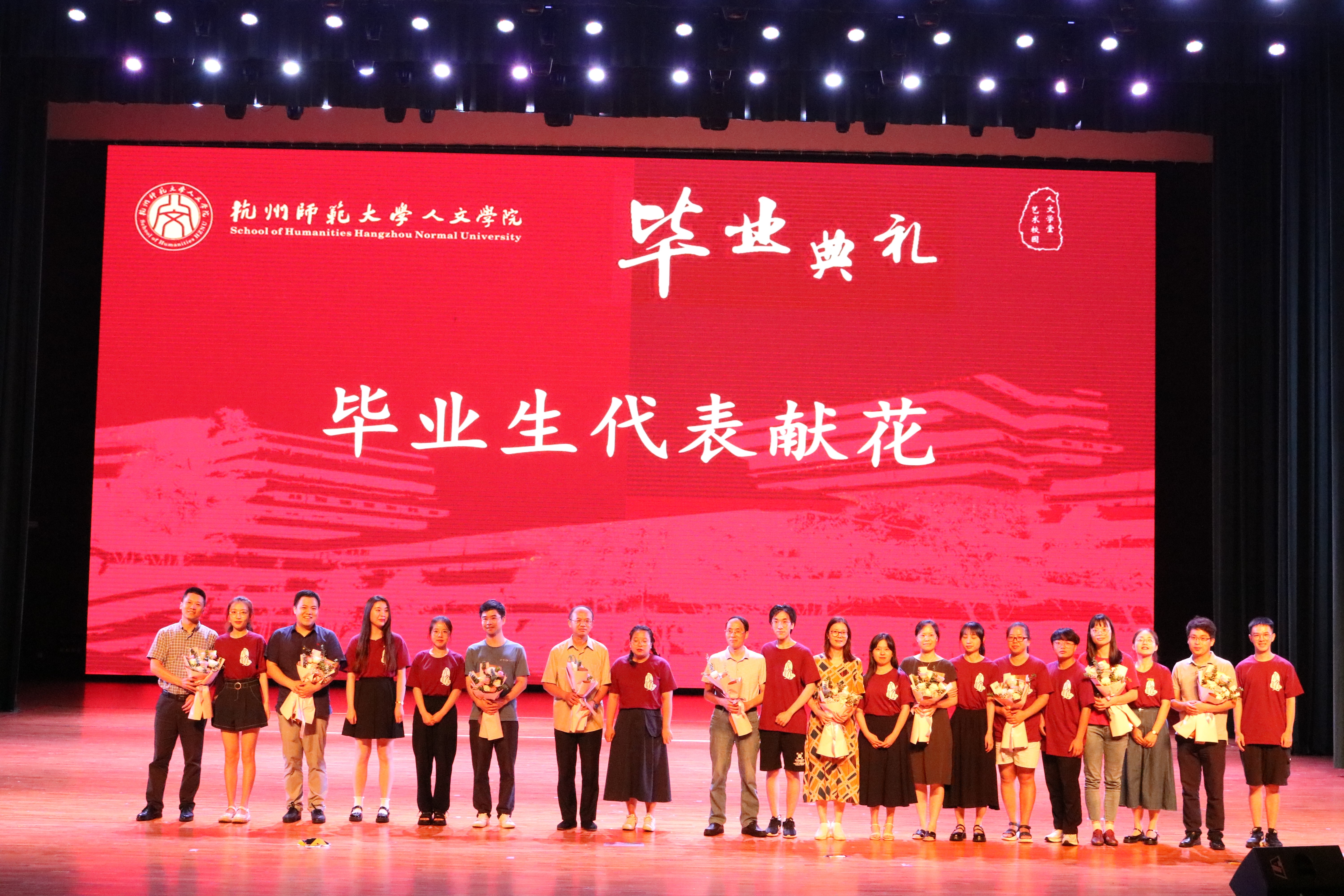 典礼在雄壮威严的国歌声中拉开帷幕。毕业典礼上,副院长刘正平和林航为浙江省优秀毕业生颁发证书,祝贺他们为大学生涯画上圆满句号。中文系主任刘小刚和历史系主任周东华为2021届校友联络员颁发聘书。毕业生代表向毕业班班主任和毕业年级辅导员献花,辅导员和班主任发表感言。党委书记诸英代表学院接受毕业生向学院赠送的山水画刺绣作品《紫气东来》并合影留念。徐大军教授、郗文倩教授作为教师代表向毕业生代表赠书留念。