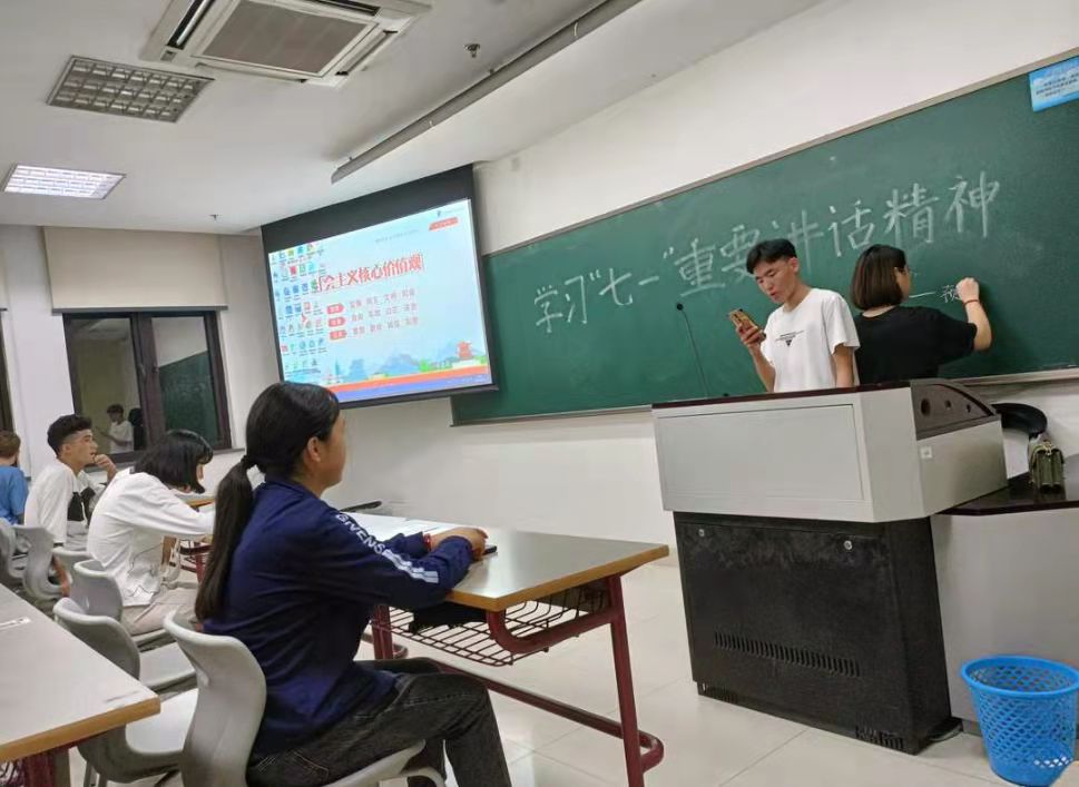 为提高预科班同学的爱党爱国情怀,2021年9月27日下午6点,预科211班在恕园12号楼304教室举行了“学习‘七一’重要讲话精神”和“请党放心,强国有我”主题活动,此次活动由中共党员中文192施颖同学主持,哈力扎提、叶斯力、古丽菲亚和迪力胡马尔四位同学辅助,预科211班全体参与。