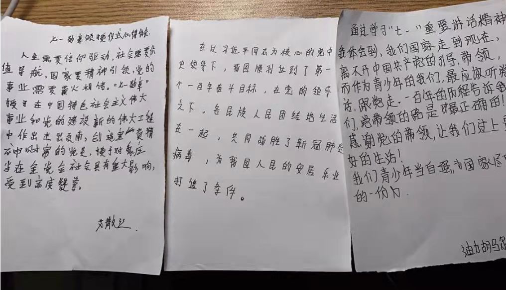 活动开始,哈力扎提、叶斯力、古丽菲亚和迪力胡马尔同学上台宣读习近平总书记在庆祝中国共产党成立100周年“七一勋章”颁授仪式上重要讲话。宣读后,同学们踊跃地发表自己的意见,米叶尔同学表达了自己对“七一勋章”的认识,她说:“中国共产党成立100年以来,走过坎坎坷坷,一次次战胜困境,从开始的十几人到现在的几千万人,‘七一勋章’是各条战线中党员杰出贡献的代表。党员对他们而言不仅是一个身份,更是一种责任,他们信念坚定,不忘初心,不移其志,以坚韧执着的理想信念,带领全国各族人民走向幸福。”米克热班同学表示:“没有共产党,就没有新中国,我们美好的生活来之不易。是中国共产党带领全国人民走向了幸福生活!”在被问到青少年应该怎么做时,米叶尔同学表示:“我们要吸取长辈们的经验,将来无论入党与否,都要以党员标准来严格要求自己,把国家与人民的利益放在第一位,为人民服务。”