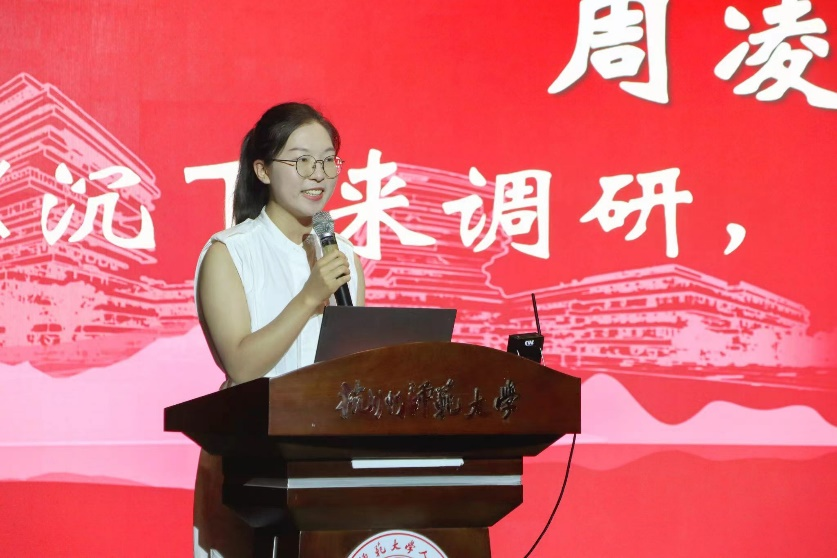 首先,“乡村共富基因解码”口述历史和宣讲社会实践团队——映山红团队的负责人周凌滢向同学们讲述了自己带领团队开展社会实践的心得与感触。她用“沉下来”与“走出去”这两个关键词概括了自己的实践经历。她认为,只有真正沉下去,深入基层,社会实践才能真正焕发其光彩;而只有带着社会实践故事从乡村走出去,以青春视角讲好共富故事、传递共富理想,才能通过自己的脚步告诉社会新时代青年的愿景与期盼。“带着社会实践故事从乡村走出去的我,最后依旧回到立足乡村文化,讲好乡村故事的起点”,周凌滢用自己的实际行动践行着乡土情怀。