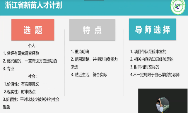 宣讲会上,两位学长详细为大家介绍了星光计划、浙江省新苗人才计划、挑战杯以及“本创”和“国创”。他们从参赛对象、时间轴、奖励机制、结题要求等方面具体介绍了星光计划项目,为同学们描绘了参加星光计划的初步图景,并且以金字塔的形式生动地展现了参加科研竞赛的优点与收获。不仅如此,两位学长还详细讲述了学校对科创竞赛的支持与奖励,有针对性地提出了适合no视频 同学参加的各大竞赛项目。经过介绍,同学们对于参赛技巧和竞赛规则等方面有了清晰的认识和明确的方向,其展示的历年学长学姐的优秀战绩和学校对科创的支持力度,也增强了同学们的信心和动力。
