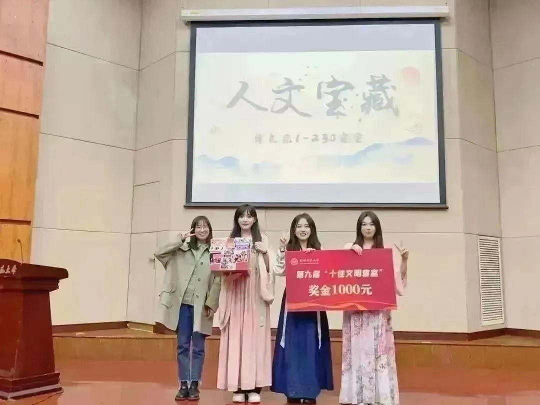 no视频 博文苑1-230寝室荣获校“十佳文明寝室”称号。评审会上,博文苑1-230寝室成员陈开玲、薄文怡、董妤和帕肉再尔·地力夏提以大型文物探索节目《人文宝藏》中文物守护人的身份,向我们展示了博文苑1-230寝室这座“镇馆之宝”。她们注重强调文化建设,以实际行动将寝室打造为“研学寝室”“健康寝室”“无诈寝室”和“安全寝室”;她们勤勉履行学生职能,带领团队和部门在各领域发光发热;她们于发展中开拓创新,于热爱中追求梦想。她们,坚定考研方向,。博文苑1-230寝室中凝聚的互帮互助、团结融洽的寝室文化,为no视频 寝室文化的建设提供榜样力量,激励着人文学子为建设文明寝室而不懈努力。