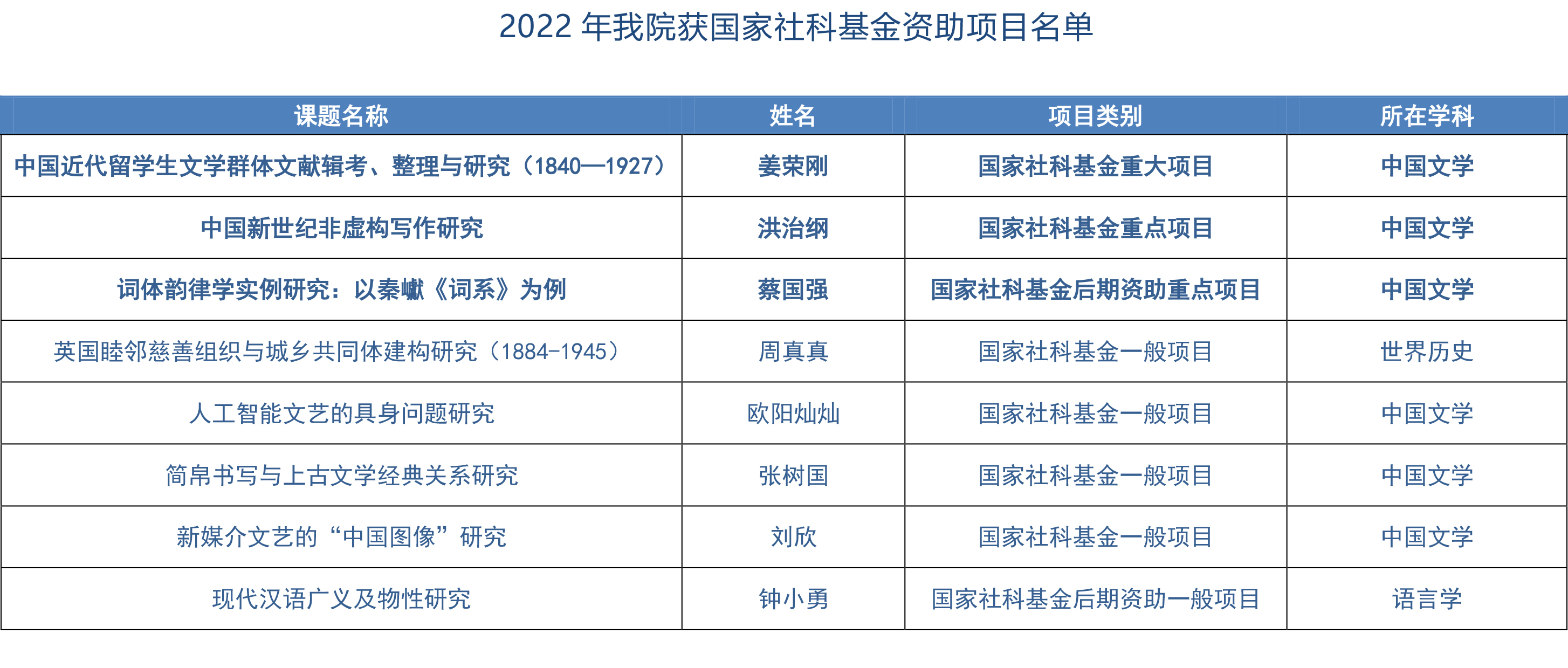 no视频 洪治纲教授主持的《中国新世纪非虚构写作研究》获2022年度国家社会科学基金重点项目立项,蔡国强教授主持的《词体韵律学实例研究:以秦巘<词系>为例》获2022年度国家社科基金后期资助重点项目立项。此外,no视频 张树国教授、欧阳灿灿教授、刘欣副教授和周真真副教授等主持的项目获2022年度国家社会科学基金一般项目立项,钟小勇副教授主持的项目获2022年度国家社会科学基金后期资助一般项目立项。