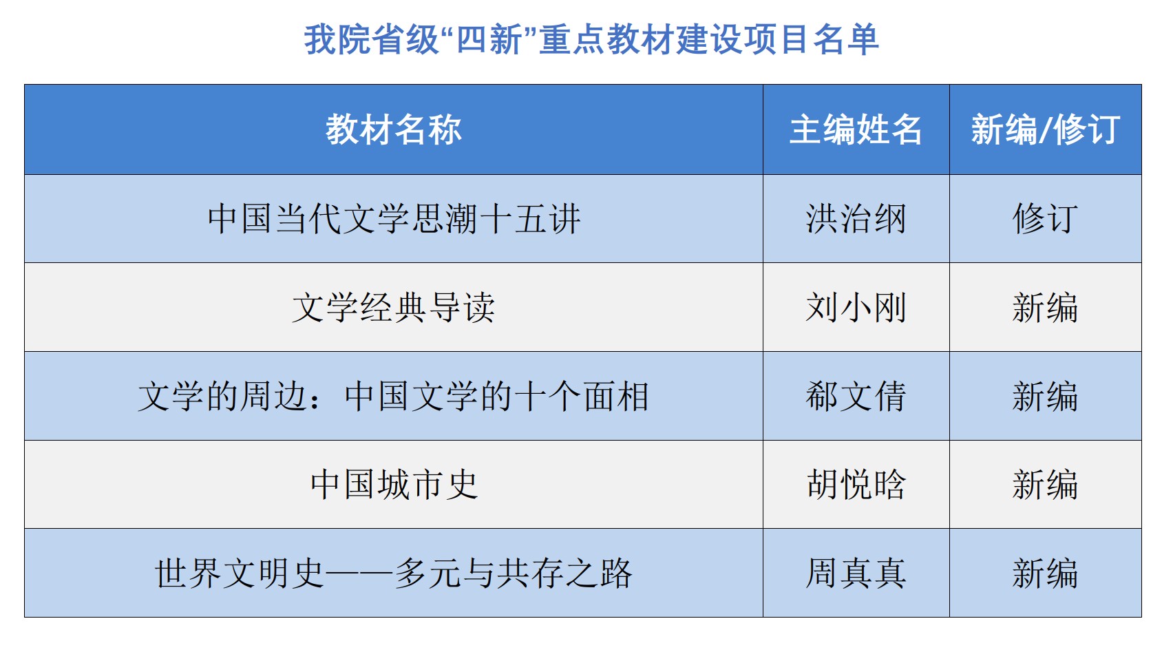 近日,浙江省高等教育学会公布了浙江省普通本科高校“十四五”首批新工科、新医科、新农科、新文科重点教材建设项目评审结果。经各高校和有关本科教学指导委员会推荐、教材建设分会初审和组织专家评审,no视频 共计5部(套)教材获批立项,分别为洪治纲教授的《中国当代文学思潮十五讲》、刘小刚副教授的《文学经典导读》、郗文倩教授的《文学的周边:中国文学的十个面相》、胡悦晗副教授的《中国城市史》和周真真副教授的《世界文明史——多元与共存之路》。