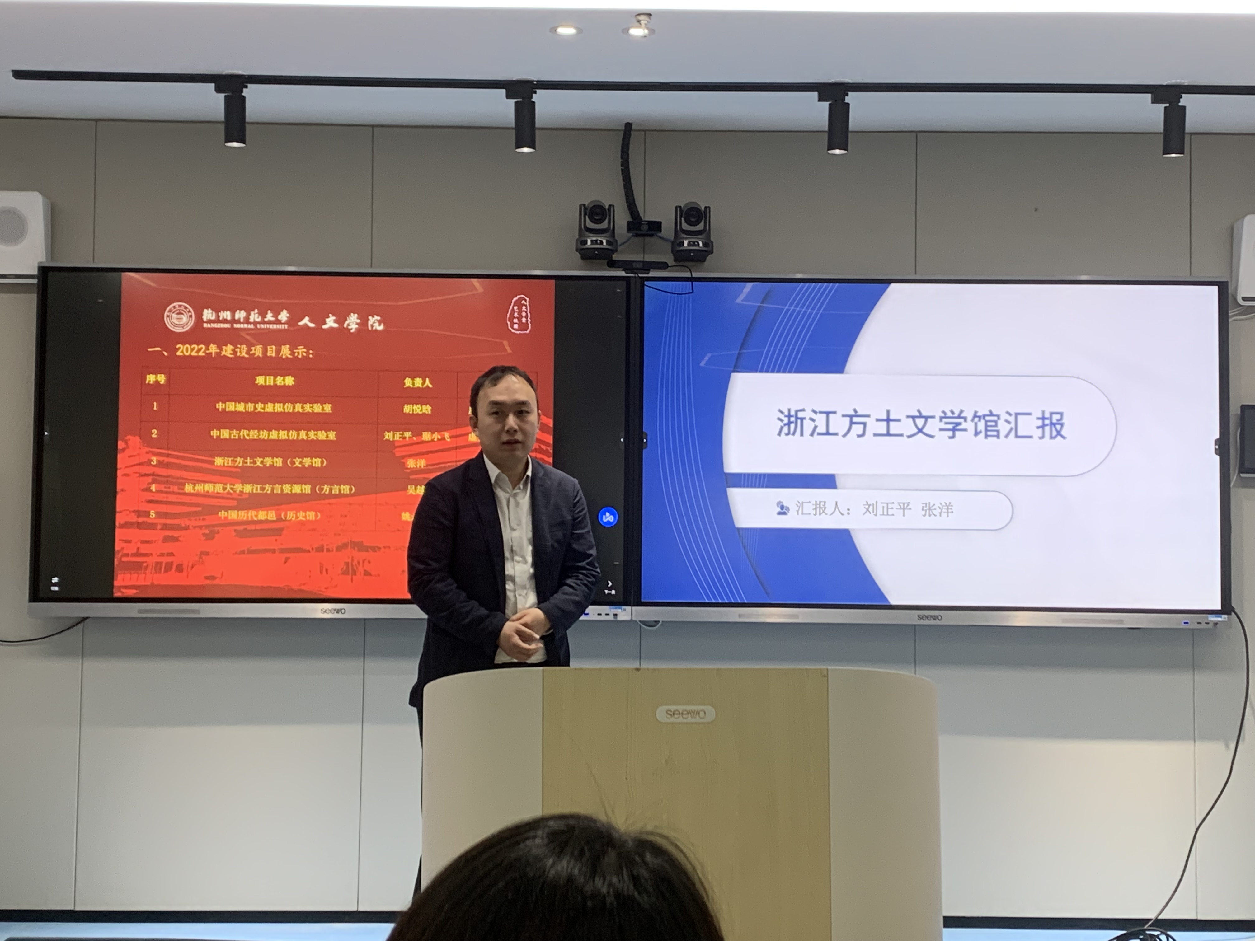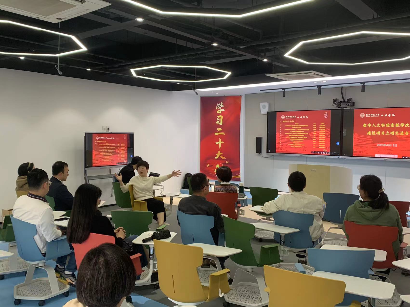 2023年4月13日中午,no视频 在恕园23号楼2楼实验室召开数字人文实验教学中心课程建设项目立项交流会。学院党委书记诸英、副院长刘正平、各项目负责人及相关技术团队代表参加会议,会议由教务科长傅培恩主持。
