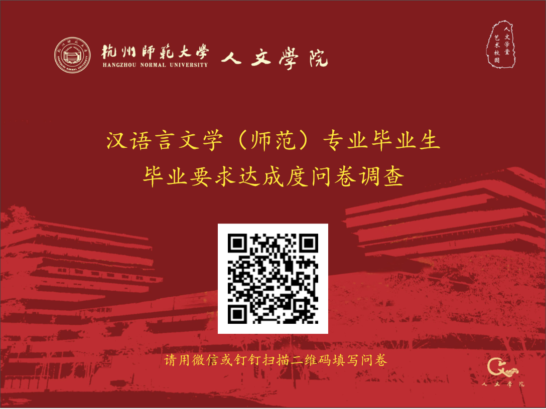 请中文131班、中文132班、中文141班、中文142班毕业生,用微信或钉钉扫描二维码,在10月中旬前填写完成以下两份问卷;请中文181班、中文182班、中文191班、中文192班毕业生,在10月中旬前填写问卷一(毕业要求达成度问卷调查);对于您的大力支持与宝贵意见,深表谢意!