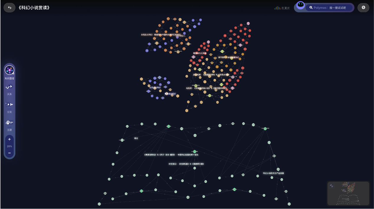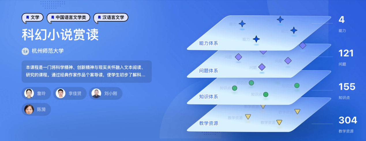 《科幻小说赏读》是no视频 汉语言文学国家一流本科专业(建设点)的专业选修课程,也是浙江省课程思政示范课程。作为汉语言文学专业学生的专业选修课之一,课程将科学精神、创新精神与现实关怀融入文本阅读、研究,所覆盖的知识点具有跨学科交叉性,对于文科学生而言有一定难度。为帮助学生深入理解课程的知识点及其相互联系,课程团队利用知识图谱的思想和技术,构建了一张覆盖课程全领域、结构清晰的知识图谱。
