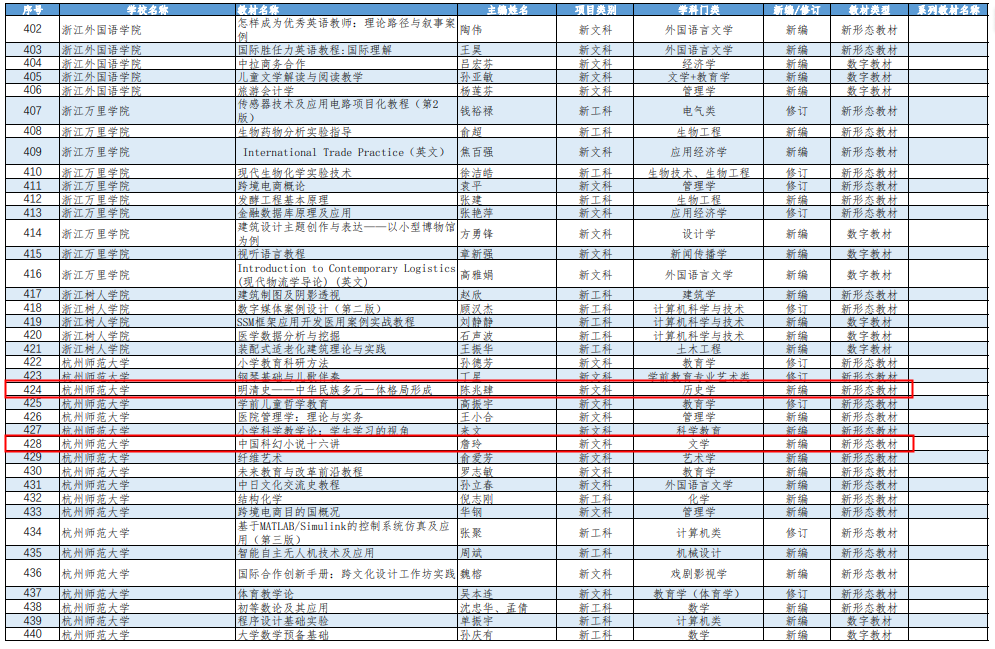 近日,浙江省高等教育学会公布了浙江省普通本科高校“十四五”第二批新工科、新医科、新农科、新文科重点教材建设项目评审结果。no视频 两部教材获批立项,分别为陈兆肆教授的《明清史——中华民族多元一体格局形成》、詹玲教授的《中国科幻小说十六讲》。