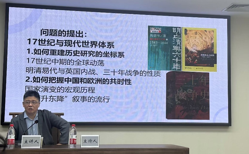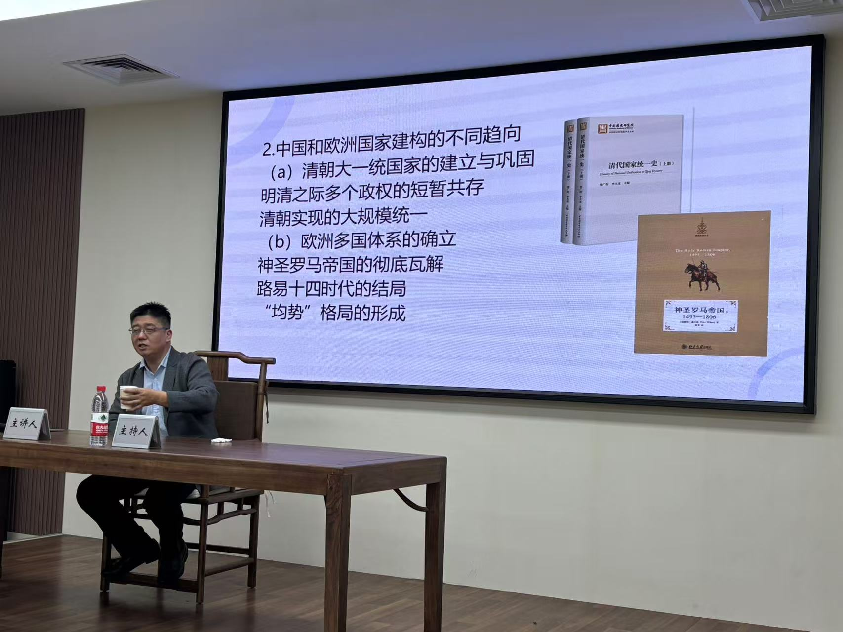 首先,从全球危机冲击下考察中国和欧洲的国家演变。17世纪发生在欧亚大陆上的明清易代和三十年战争导致明王朝和哈布斯堡王朝的崩溃,从此中国和欧洲展现出不同的国家建构方式。在中国,清朝实现了大规模的统一;在欧洲,神圣罗马帝国瓦解,欧洲多国体系确立,均势格局逐渐形成。其次,朱浒老师分析了“大一统”和“自然法”的内涵,深入阐述中国大统一与欧洲大分裂的政治逻辑。清朝通过收复西北边疆地区以及联盟蒙古和西藏赋予了大一统以新的涵义。在欧洲,流行着以格劳修斯、霍布斯与普芬道夫为代表的现代自然法的国家学说,威斯特伐利亚体系的形成意味着对主权国家原则的普遍承认,不允许欧洲大陆存在强有力的帝国,以期实现永久和平。最后,通过观察清代中国和近代早期欧洲的国家关系取向来探究两种不同政治逻辑的实际运作情况。朱浒老师认为,“和为贵”是清朝处理国家关系的主轴,清朝坚定维持宗藩关系从而拒绝了哈萨克内附的请求,并且从未发动过对外的侵略战争。而欧洲却截然相反,欧洲国家出于利益和安全的考虑,进行了大规模的军备竞赛从而催生出了“军事革命”与“科学革命”。