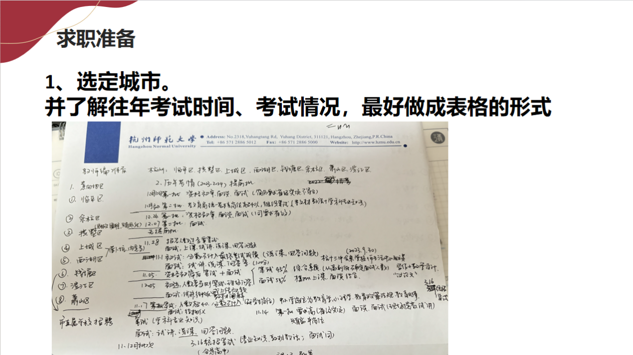 轻点光标,大屏幕上的一张照片引发惊叹:A4纸上缜密而有序地写满杭州市各地区教师招聘的时间节点与考核情况,“我当时列了一个表格搜集往年的招考情况,在这个比对的过程当中,你也能够更加清晰地看到各个区之间招聘条件的不同,以及最适合你的招考条件到底是什么”。针对职业规划,钟依菲提出“早定位、精聚焦、重现实”三原则,强调“教育情怀需与城市发展、个人特质共振”,并以自身择业心路为例,展现教育从业者的初心坚守。