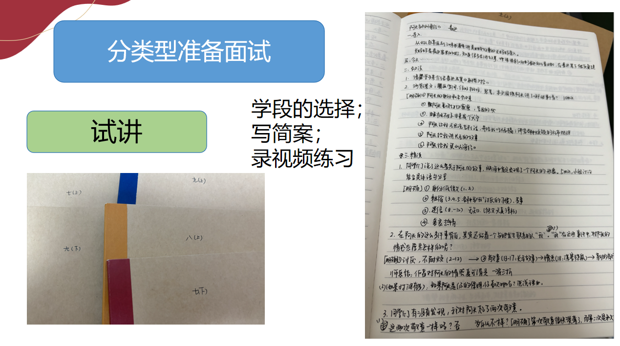 备考策略环节,钟依菲独创的“任务导向式学习法”引人深思:通过分模块突破笔试难点、录制试讲视频反刍提升等实战技巧,助力学生构建系统化备考体系。现场更展示其备考期间按学段划分、手写的多篇精品教案,见证“厚积薄发”的奋斗力量。