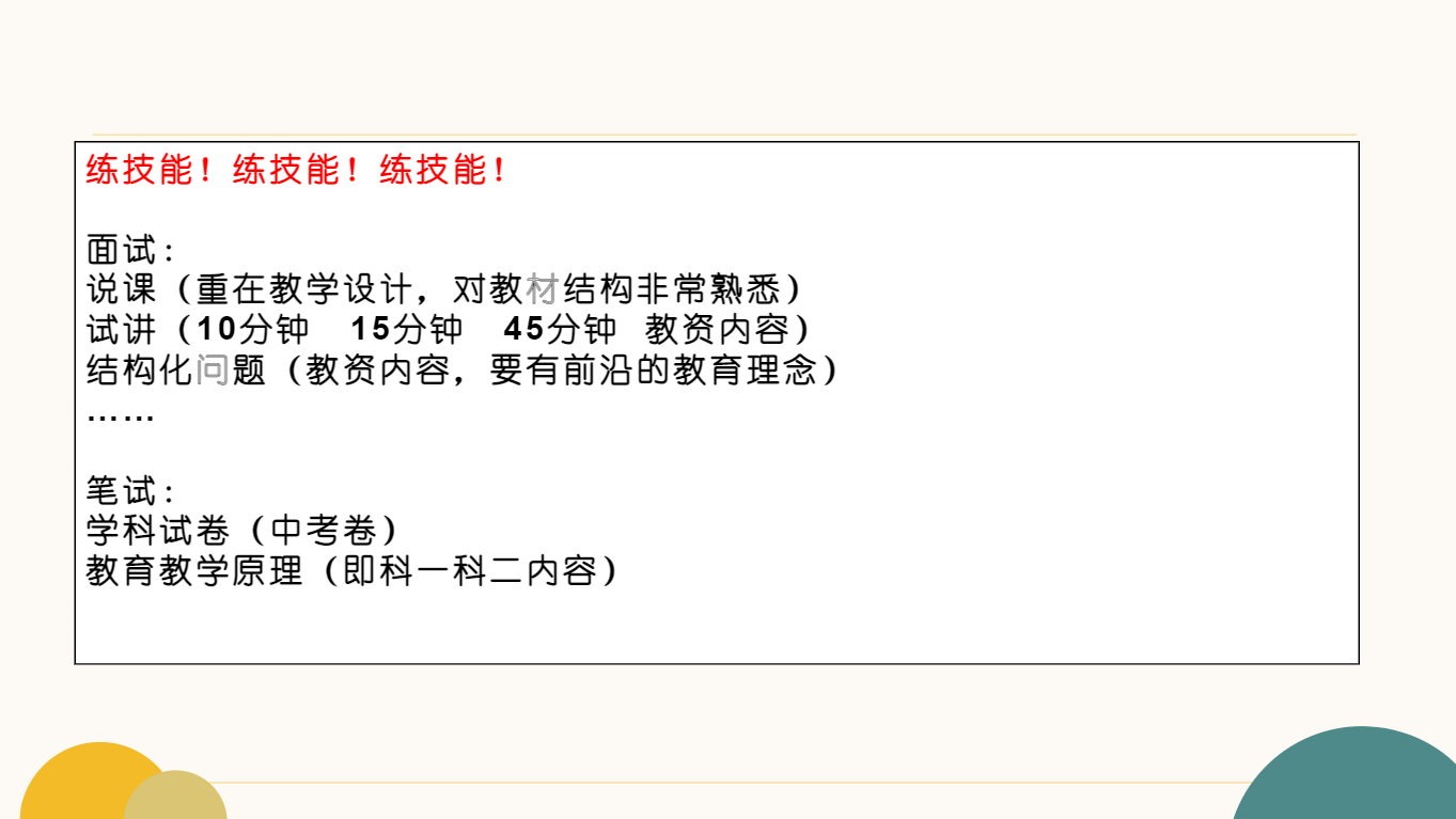孙超从两方面分享求职攻略。一是教资备考有的放矢、合理规划。她建议以分阶段刷题与视频学习相结合的方式,集中安排15 - 30 天进行全面复习,避免备考战线拉得过长,确保复习效果。面试环节亦是备考关键,需要着重攻坚。每周安排 3 次模拟课堂练习,录制视频复盘教态是否亲切自然、大方得体,语言表达是否流畅清晰、富有感染力。而准备结构化问题时,要注重关注前沿教育理念,如核心素养、项目式学习等,展示自己对教育发展的敏锐洞察力和深刻理解。