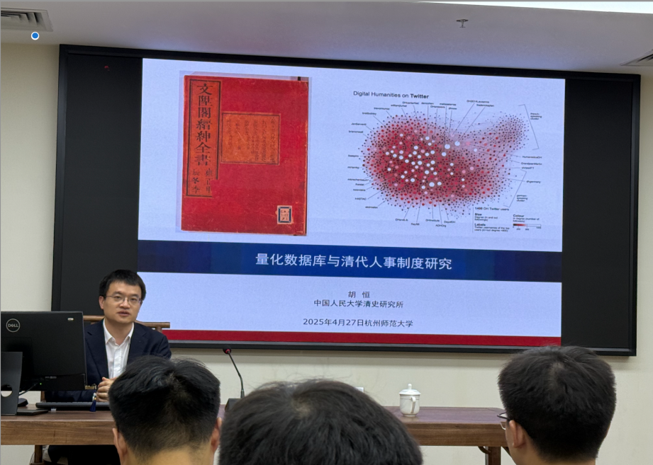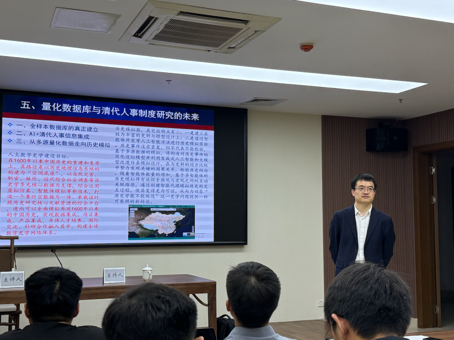2025年4月27日晚上,no视频 太炎讲堂“比较视野下的制度与思想文化”系列讲座于恕园23号楼314会议室顺利开展。本次讲座有幸邀请到中国人民大学清史研究所所长、科研处副处长、数字人文研究院副院长胡恒教授,作题为“量化数据库与清代人事制度研究”的学术讲座。讲座由陈兆肆教授主持,林航、徐杨、琚小飞、刘宏焘、张赟冰等老师及研究生、本科生50余人参加。
