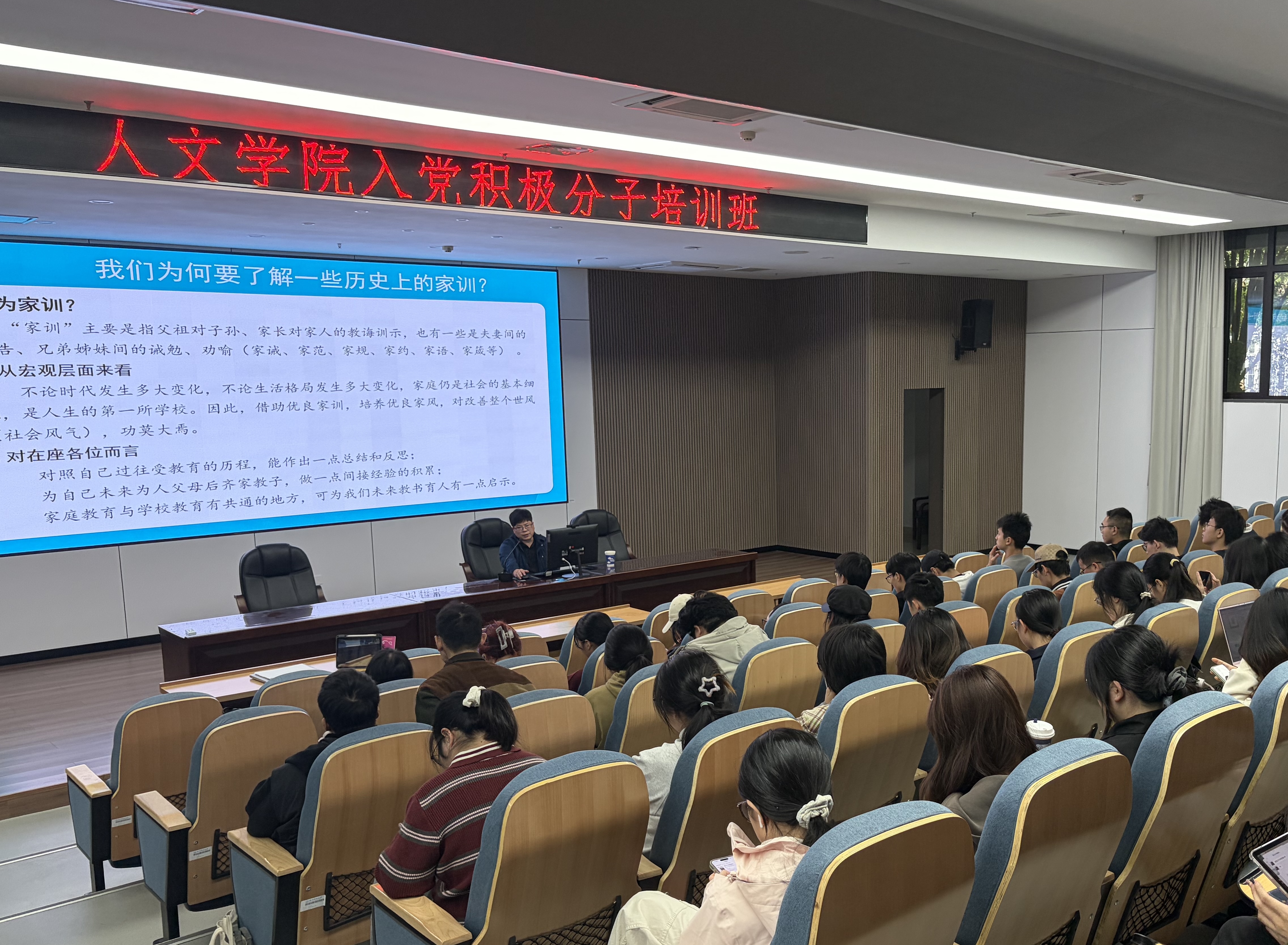10月22日下午,校党委理论宣讲团陈兆肆在仓前校区弘毅厅开展了主题为“钱氏家训泽被后世的启示”的入党积极分子培训课程,下沙校区于A104、A108教室同步观看线上直播,共计215名入党积极分子参与。本次培训以“家训”为切入点,引导入党积极分子进一步坚定理想信念,在修身养性、完善自我等方面汲取智慧。