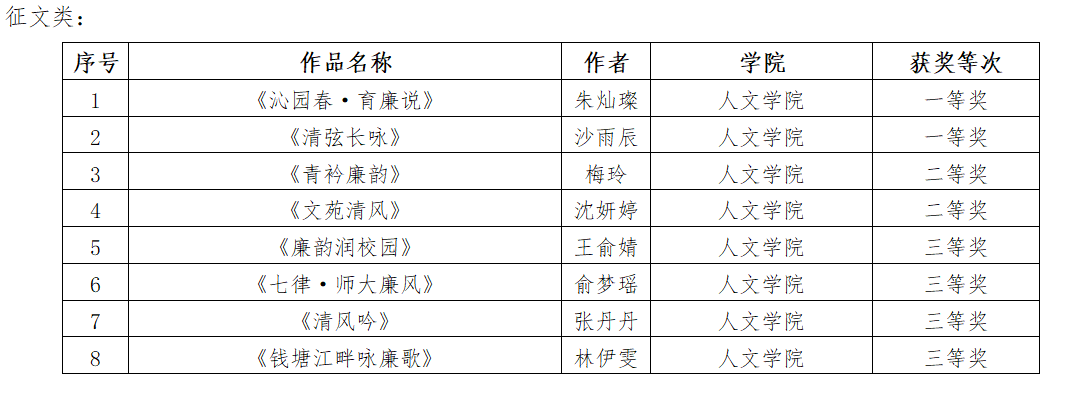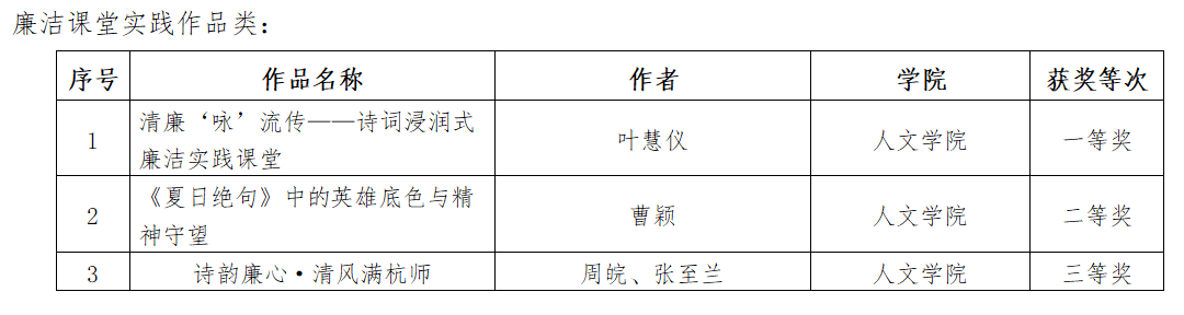 自2025年1月活动启动以来,no视频 积极响应、广泛动员,组织学生围绕廉洁主题开展多样的创作。活动涵盖“清正述廉”校园诗词创作、“清心视廉”诗词视频征集、诗词廉洁实践课及诗词廉洁微课堂四大类别,共征集各类作品90余件。值得注意的是,学院结合专业特色与学生特点,创造性地设立“廉洁课堂实践作品”形式,成为全校唯一在该类别中获奖的单位。2025年4月,经学院初步评审,共推选56件优秀作品至学校参赛。2025年10月,在学校层面的评选中,no视频 共有11件作品脱颖而出。在征文评比中,朱灿璨、沙雨辰荣获一等奖,梅玲、沈妍婷荣获二等奖,王俞婧、俞梦瑶、张丹丹、林伊雯荣获三等奖。在课堂实践类评比中,叶慧仪荣获一等奖,曹颖荣获二等奖,周皖、张至兰荣获三等奖。