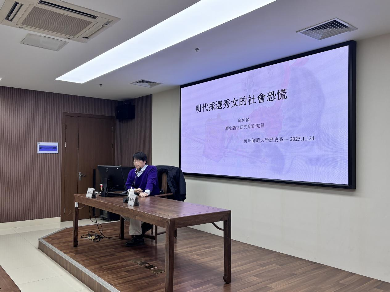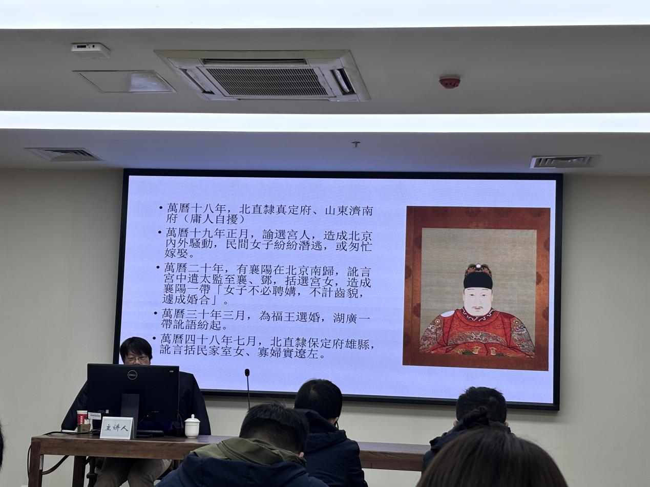 2025年11月24日下午,no视频 太炎讲堂“比较视野下的制度与思想文化”系列讲座第336讲在恕园23号楼314会议室顺利举办。台北“中研院”历史语言研究所研究员邱仲麟受邀就“明代采选秀女的社会恐慌”一题作专题讲座。讲座由no视频 历史学系副教授余清良主持,张赟冰、余辉、赵卓等老师及研究生、本科生一同到场聆听本次讲座。